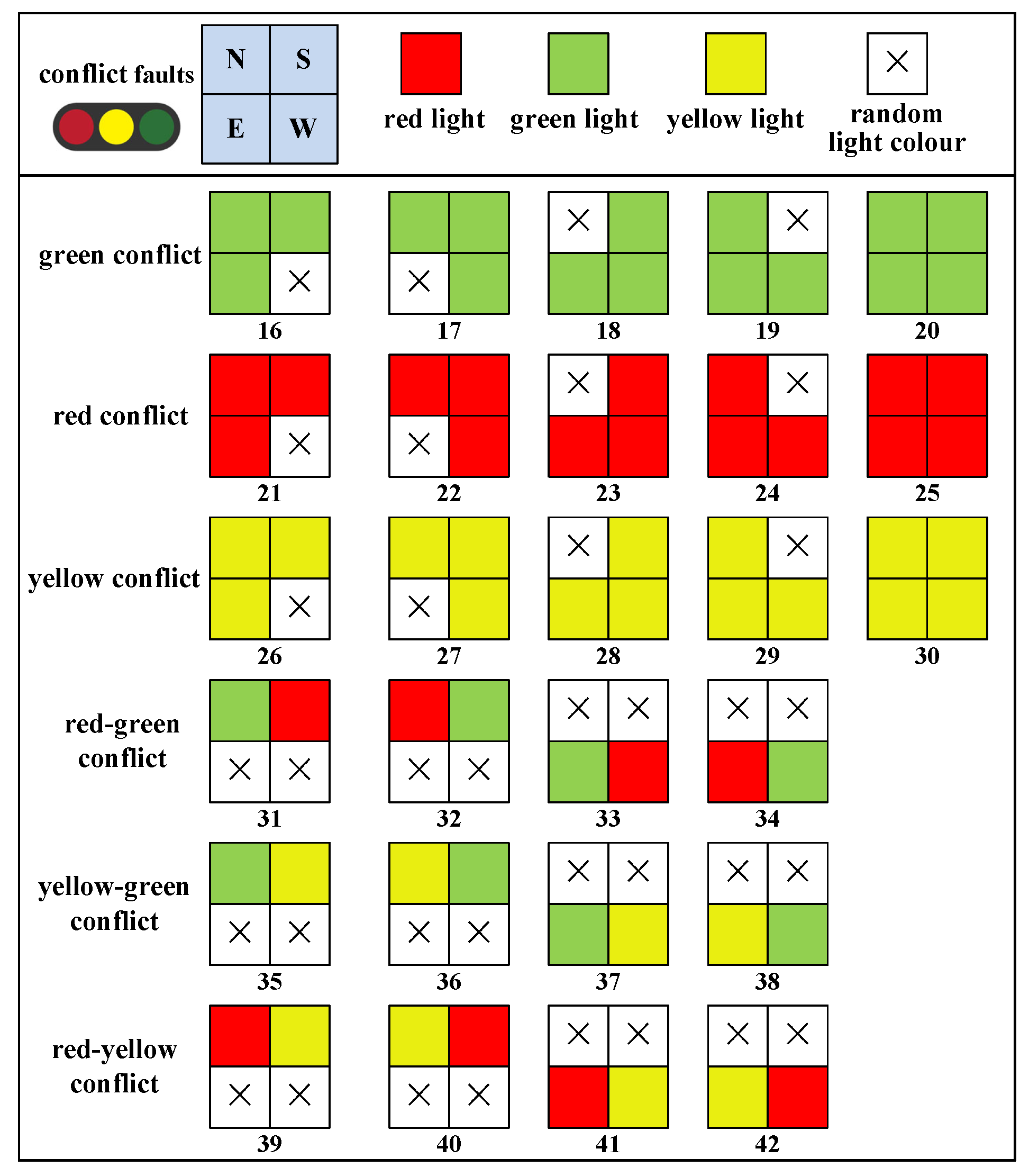The fundamental approach to identifying anomalous signals entails the continuous acquisition of color and position data from the traffic video stream over an extended period. This extensive dataset is then utilized as a foundation for fault detection. The color change that occurs during the transition phase of the signal is the most complex aspect to consider; however, a brief anomaly does not necessarily indicate a malfunction of the signal. In order to achieve this objective, the model calculated the number of red, green, yellow and extinguished lights that occur within a cycle length. This was achieved by undertaking a comprehensive signal operating cycle at the current intersection, which was then utilized as a benchmark. Subsequently, the model established the respective time thresholds for various fault categories. In the event of the “fault frame” in the video stream occurring continuously and exceeding the predefined time threshold, it would be judged as a fault. As illustrated in Figure 6 for black faults and Figure 7 for conflict faults, the fault types delineated in Table 3 are further subdivided into a total of 42 categories.