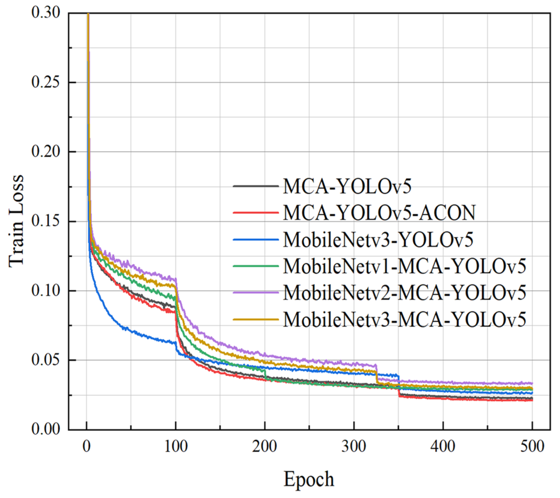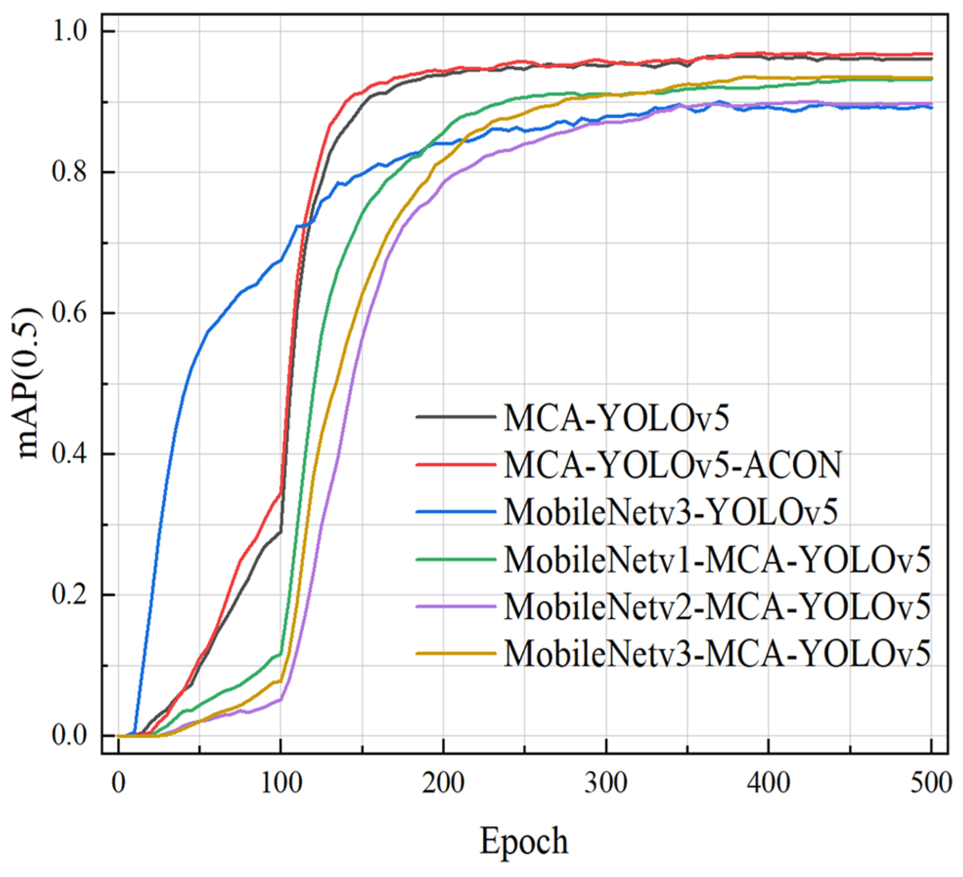 The fundamental architecture of YOLOv5 is predicated on CSPDarknet, a network layer that is both profound and voluminous, rendering it ill-suited for deployment on edge devices and impeding the efficiency of inference. In this paper, the MCA-YOLOv5-ACON model was lightened by the introduction of a lightweight MobileNet family of networks, which replaced the original CSPDarknet network.