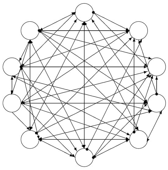 The topology of the binary CA used in NEAL. There are eight excitatory neurons and two inhibitory neurons, all represented by hollow circles. The arrows represent excitatory synapses, and the lines capped with small filled circles are inhibitory synapses.