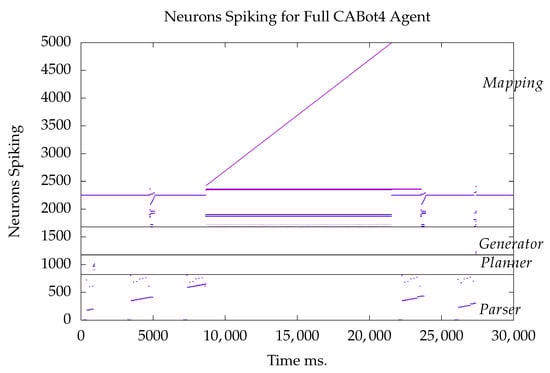 The simple agent consists of 2034 neurons, 550 in the parser, 399 in the planner, 360 in the generator, and 770 in the cognitive map. An example run is shown in Figure 2. Each dot represents a spike by a neuron at a particular time step.
