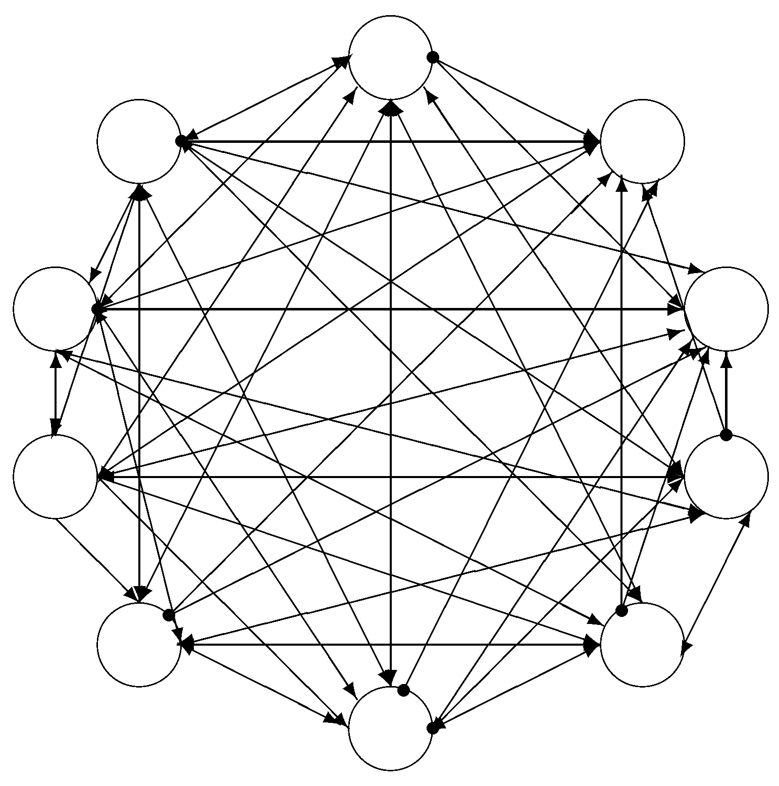 Figure 1. The topology of the binary CA used in NEAL. There are eight excitatory neurons and two inhibitory neurons, all represented by hollow circles. The arrows represent excitatory synapses, and the lines capped with small filled circles are inhibitory synapses.