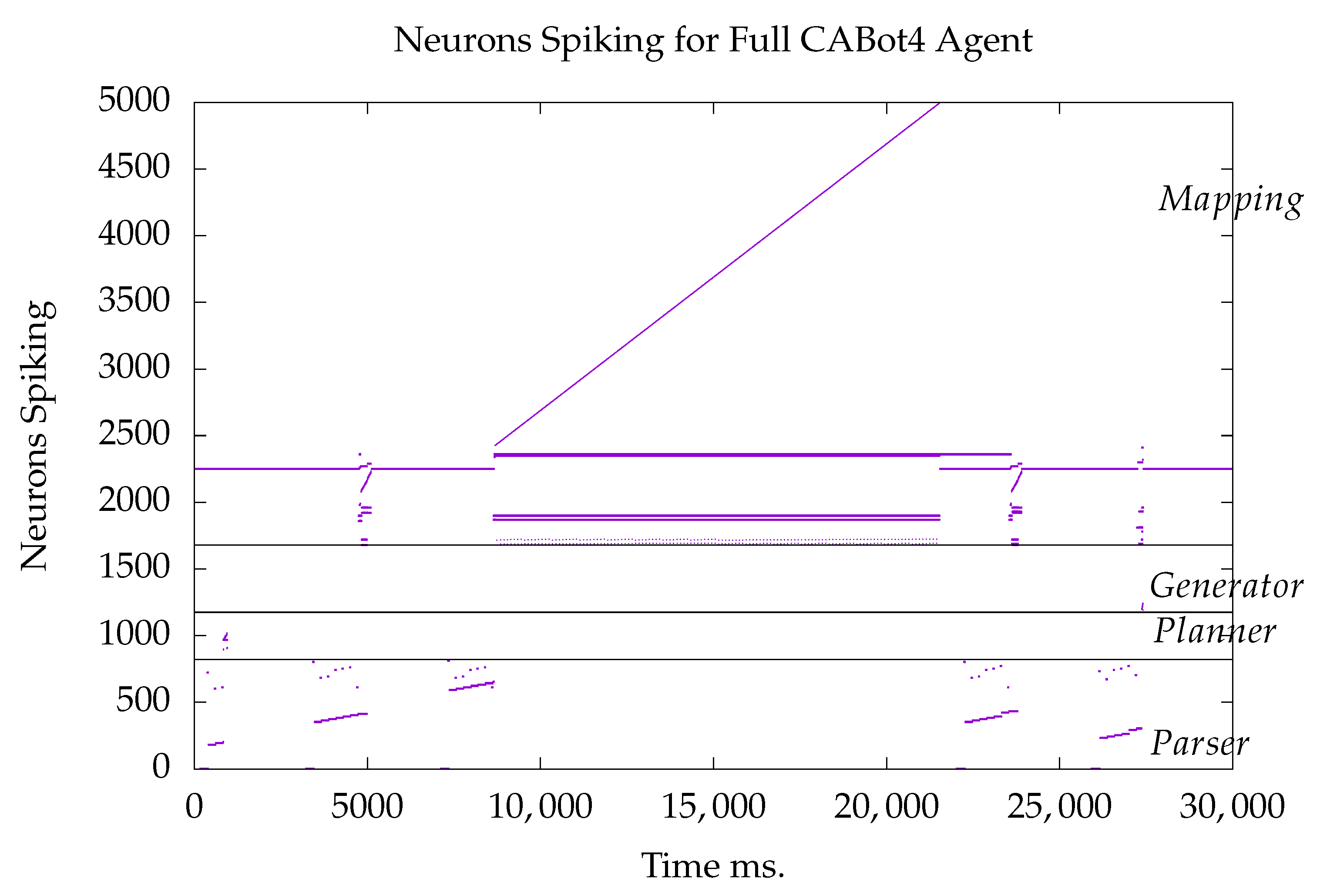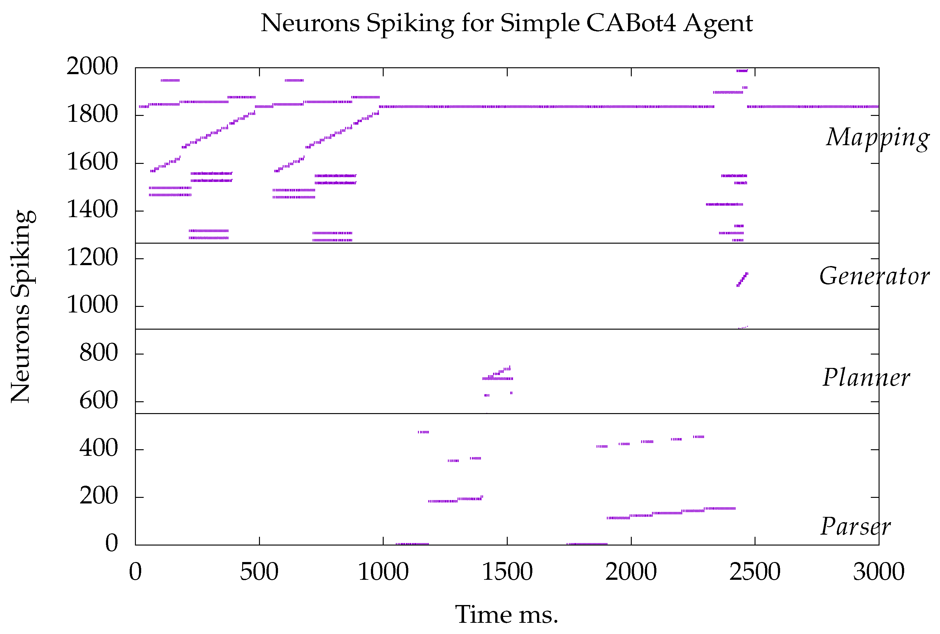 The simple agent consists of 2034 neurons, 550 in the parser, 399 in the planner, 360 in the generator, and 770 in the cognitive map. An example run is shown in Figure 2. Each dot represents a spike by a neuron at a particular time step.