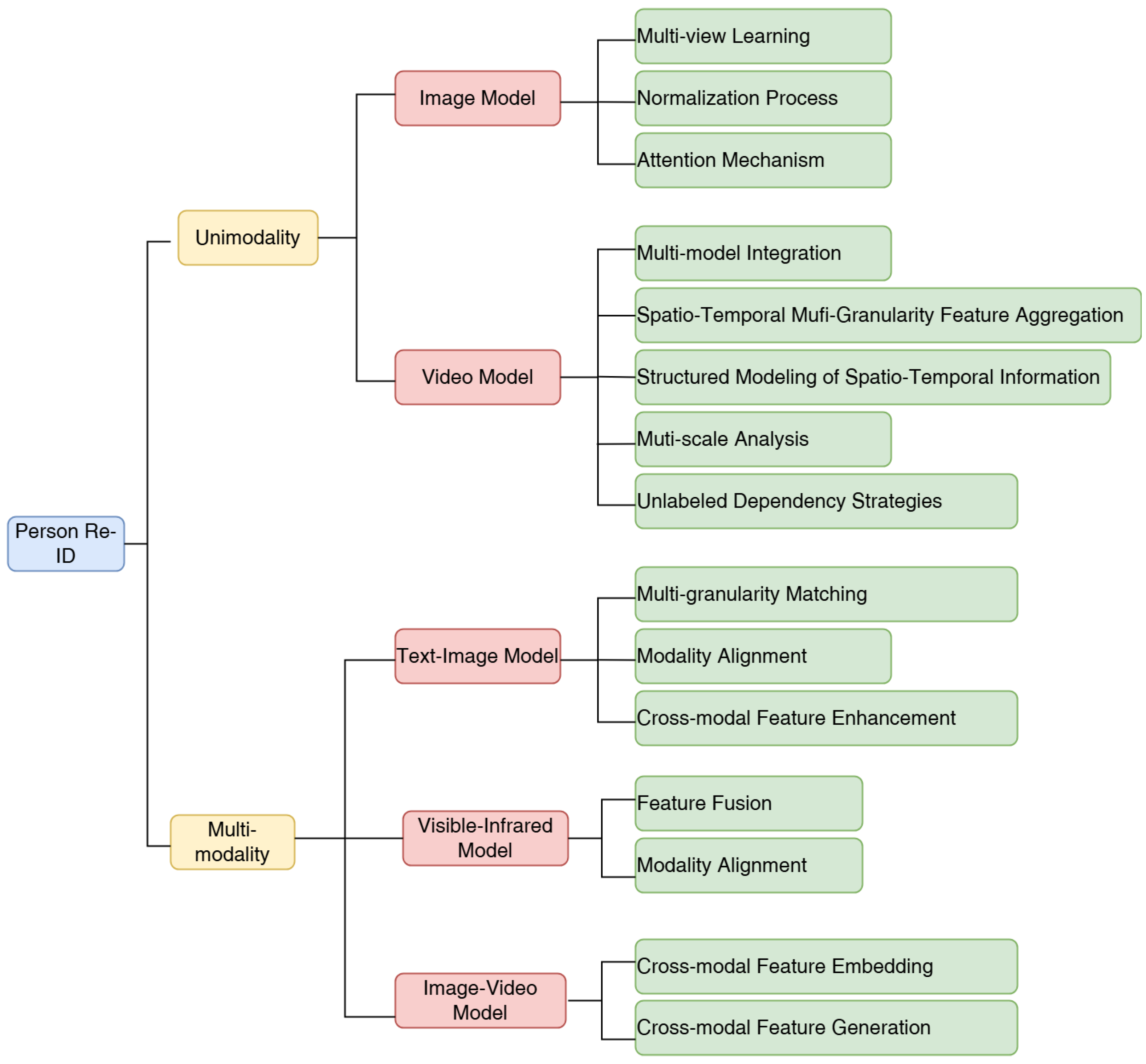 Zheng et al. [3] focused on visible-infrared cross-modal person Re-ID (VI-ReID), developing a comprehensive framework organized around four key dimensions: modality sharing, modality compensation, auxiliary information utilization, and data augmentation strategies. Their analysis proposes future directions emphasizing lightweight architectures and semi-supervised learning for VI-ReID systems.