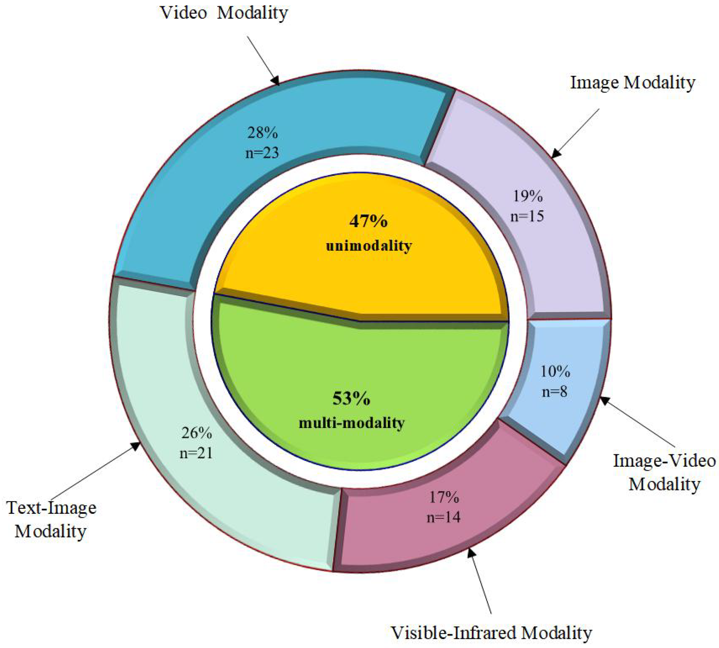 • Cross-modal datasets (30%) emerge to address real-world challenges, with infrared-visible datasets (15%) and text-based datasets (15%) leading this trend.