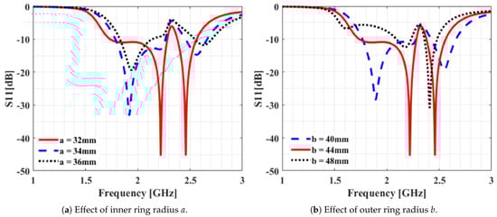- Xiang, Z.; Wang, Z.; Li, C.; You, R. Design of UWB monopole antenna with ring structure based on characteristic mode theory. Prog. Electromagn. Res. C 2025, 158, 225–234. [Google Scholar]