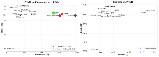 Model complexity and performance comparison between the proposed method and other lightweight methods on Manga109 [20] for SR. The left subplot illustrates the relationship between PSNR (a measure of image reconstruction quality), parameters, and FLOPs (a measure of computational complexity) for different SR methods. The sizes of circles in the figure denote the models’ FLOPs. The right subplot illustrates the relationship between PSNR and runtime (a measure of computational efficiency) for different SR methods. The proposed MAMN achieves a better trade-off between computational complexity (reflected by parameters, FLOPs, and runtime) and reconstruction performance (reflected by PSNR) compared to other lightweight SR models.
