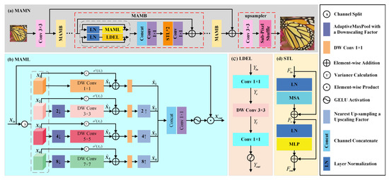 The upper figure shows the network architecture of the proposed MAMN. The MAMN comprises a convolution layer, multi-scale adaptive modulation blocks (MAMBs), and an upsampler layer. The key component of an MAMB consists of a multi-scale adaptive modulation layer (MAML), a local detail extraction layer (LDEL), and two Swin Transformer Layers (STLs).