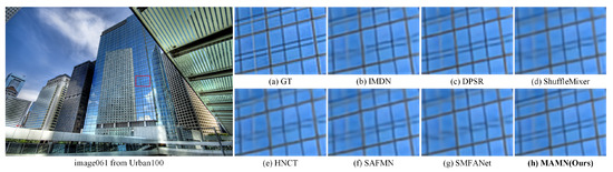 Running time comparisons. To further assess the computational efficiency and practical applicability of various SR methods, we compare the inference times of different methods (including DPSR [48], LatticeNet [30], HNCT [34], ShuffleMixer [32], SAFMN [10], SMFANet [36], and SRConvNet [50]) when performing SR on 50 images with a resolution of pixels. The test platform utilizes an Intel(R) i5-13600KF processor (20 cores @ 3.5 GHz), 32 GB system memory, and an NVIDIA GeForce RTX 4060 Ti GPU running on the Windows operating system. Based on the running time comparisons presented in Table 3, the proposed MAMN achieves an average inference time of 0.066 s. This performance demonstrates highly competitive efficiency among state-of-the-art methods.