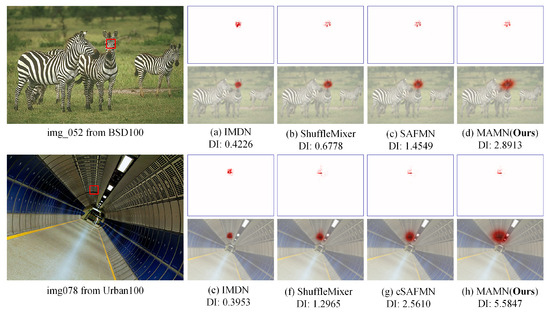 LAM comparisons. The Local Attribution Map (LAM) [52] highlights significant correlations between red pixels and rectangular reference patches during the reconstruction process. In Figure 5, we compare the LAM visualizations of the proposed method with other efficient SR approaches [10,29,32] and annotate the corresponding Diffusion Index (DI) value below each subfigure. Higher DI values indicate a broader range of pixel participation in the reconstruction. The results demonstrate that the proposed MAMN effectively integrates information from a wider spatial area, leading to superior reconstruction quality.