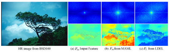 The power spectral density (PSD) and feature map visualizations. The low-frequency components are shifted to the center via periodic spectrum map transformation, which indicates that the brighter center region of the image represents the stronger energy of the low-frequency component. The MAML activates more low-frequency components for feature , and the LDEL enhances high-frequency representations for feature .