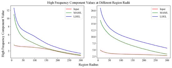 The high-frequency components are shown on the feature map across different radius areas of input, MAML, and LDEL. The results demonstrate that the LDEL contains more high-frequency components.