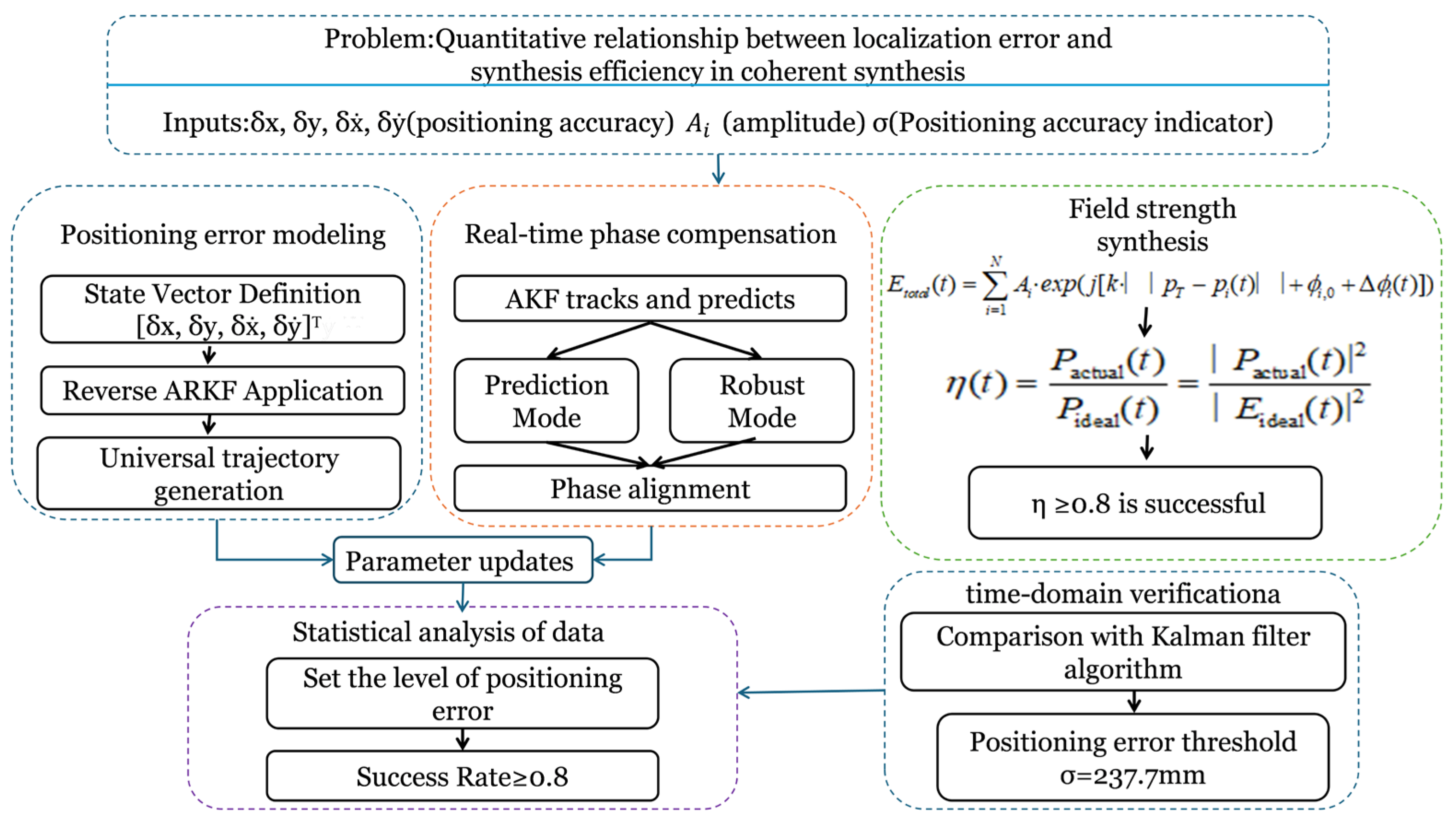 - Paradigm Innovation: A quantitative design paradigm mapping localization errors to synthesis performance is established for the first time, providing clear design criteria for system engineers. Specifically, through Monte Carlo simulations based on our framework, the quantitative relationship “positioning error standard deviation σ versus coherent synthesis success rate” is systematically charted for the first time, yielding critical performance thresholds (e.g., σ = 237.7 mm). This directly translates abstract error statistics into concrete, actionable specifications for navigation system accuracy design. The research block diagram of this paper is presented below.