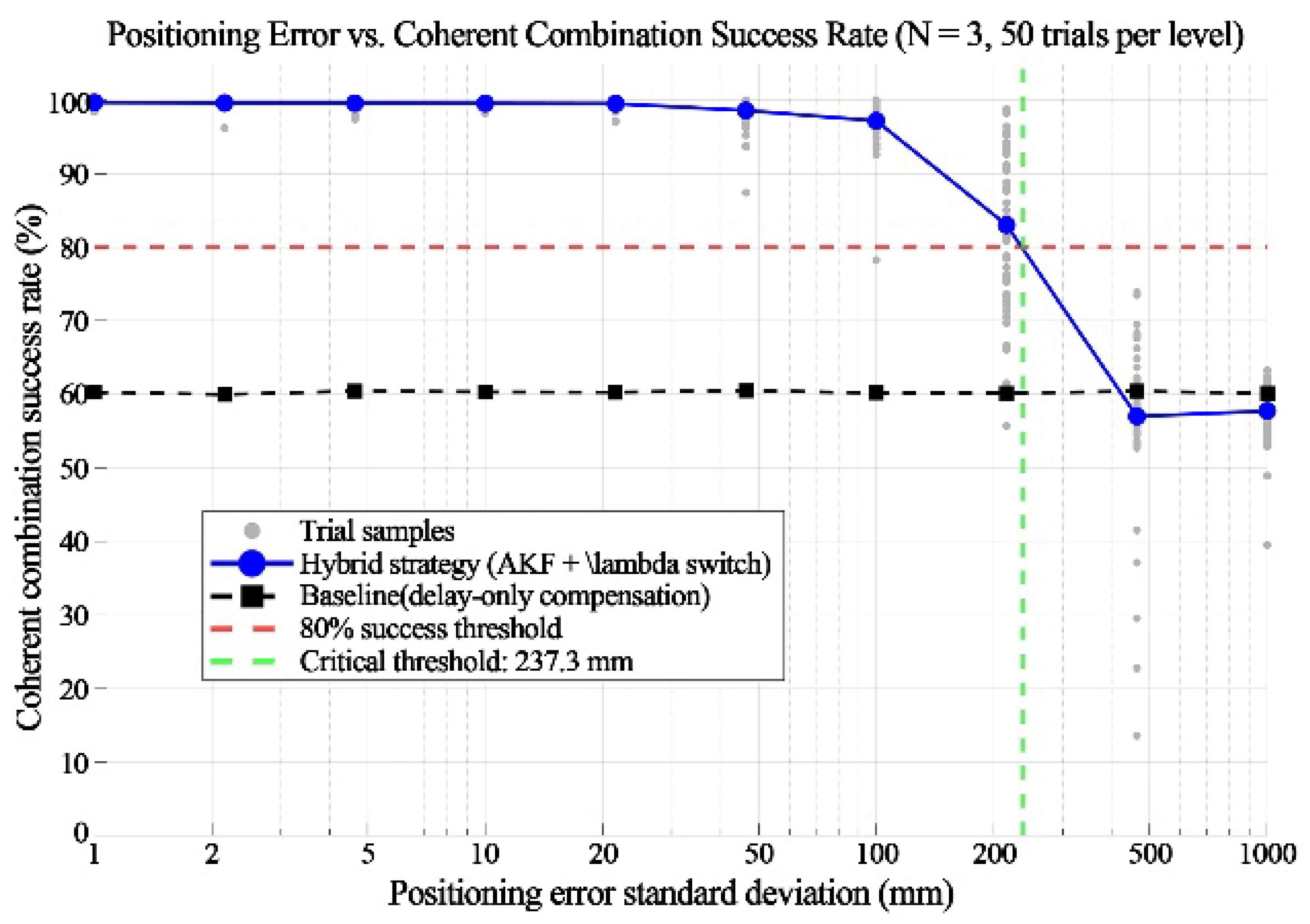 - Theoretical Innovation: The ARKF error modeling, as a supporting module, enables us to establish, for the first time in the context of distributed coherent synthesis, a reliable quantitative relationship between the statistical characteristics of positioning errors and the coherent success rate, avoiding the evaluation bias caused by traditional white noise models.