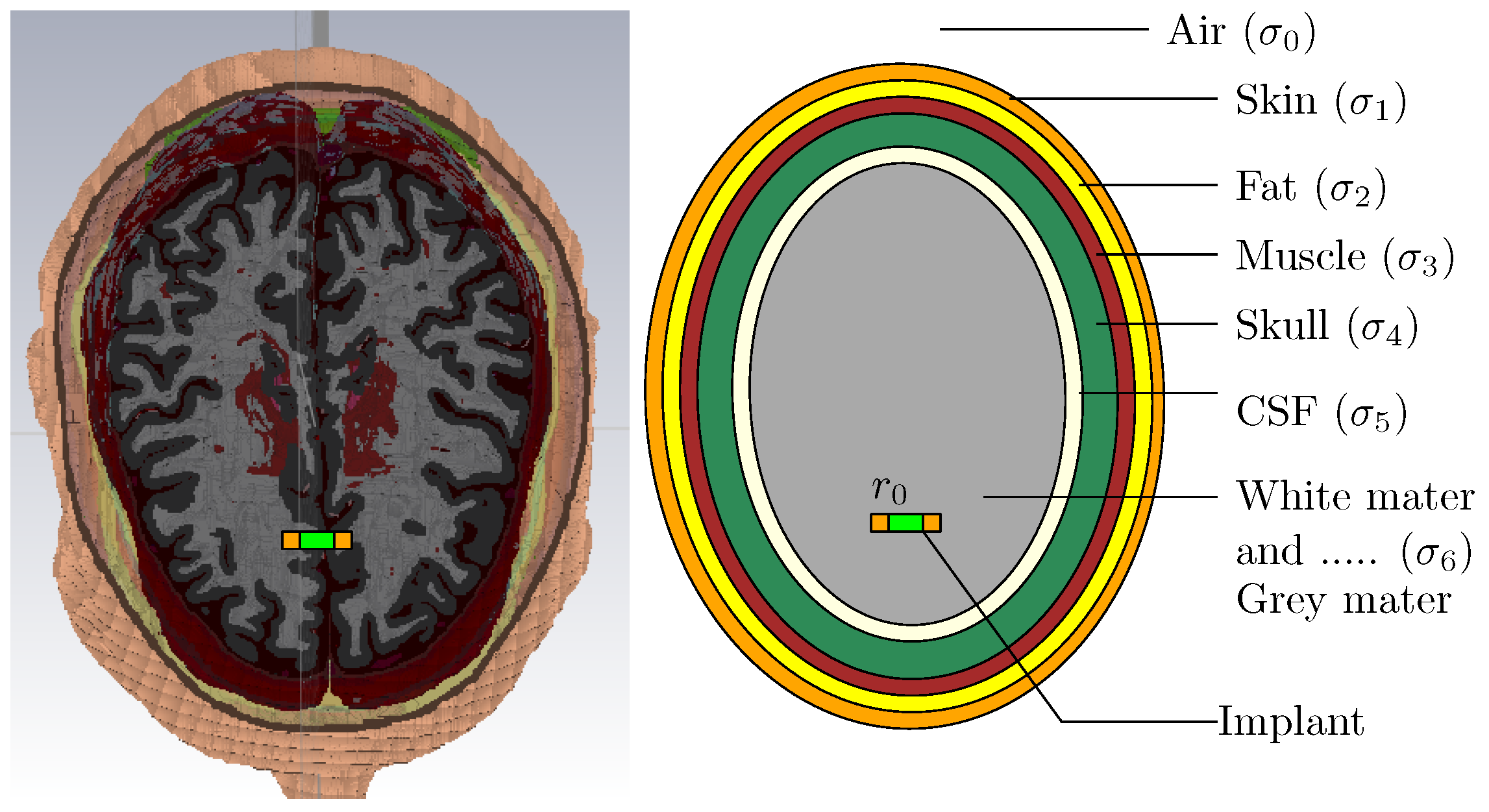 The analytical model proposed for the galvanically coupled IBC (gc-IBC) scenario has been validated through electromagnetic simulations conducted using CST Studio Suite (Computer Simulation Technology, Darmstadt, Germany). An EQS solver was employed to simulate an implant positioned at the cortical surface, with a 20 mm spacing between the transmitter’s anode and cathode, in the configuration illustrated in