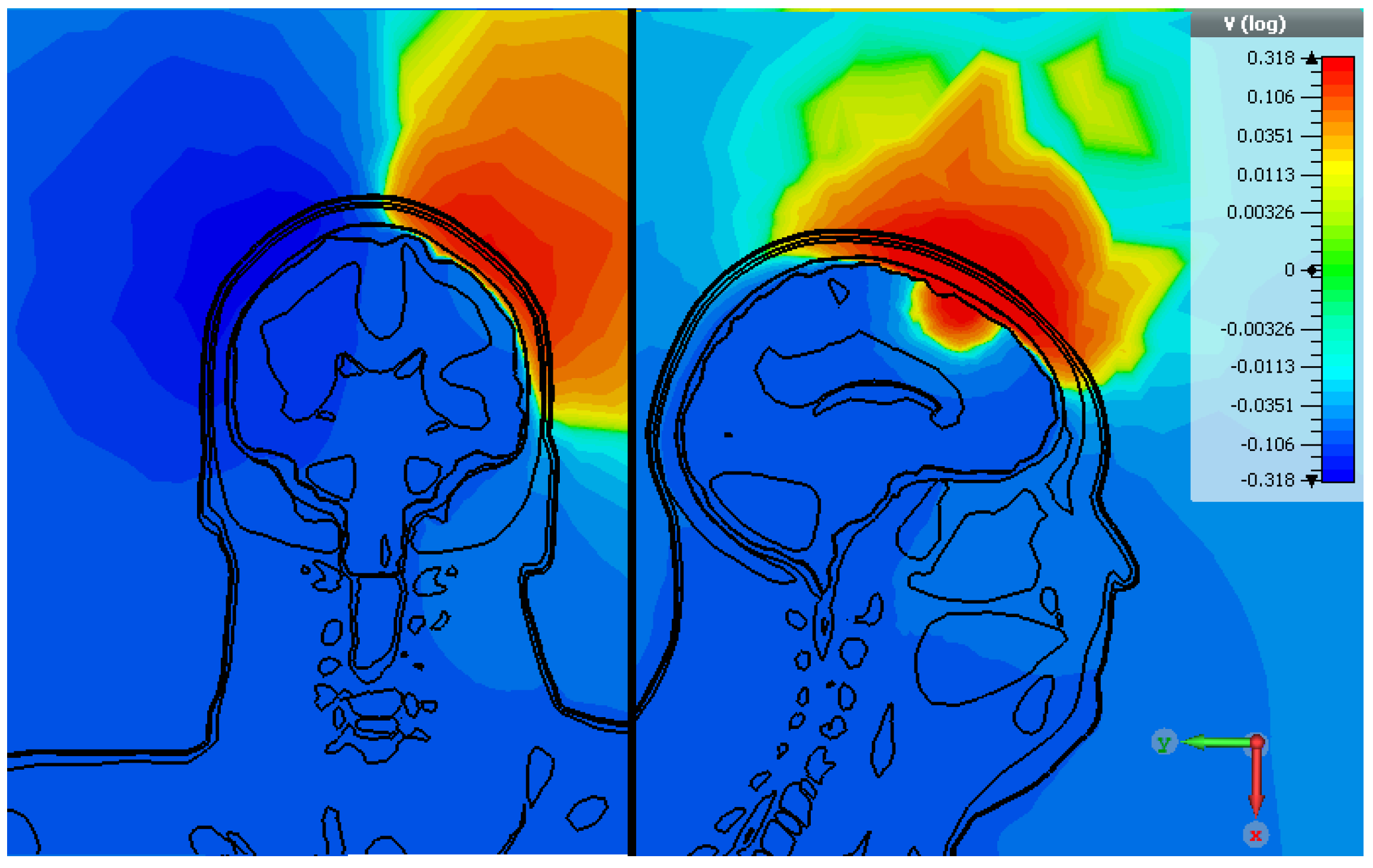 The simulation results reveal that the displacement current magnitude is generally over an order of magnitude greater than the conduction current throughout most regions. An exception occurs within the Cerebrospinal Fluid (CSF), where the conduction current dominates due to the CSF’s relatively high electrical conductivity—approximately 2 S m−1 at 2 MHz.