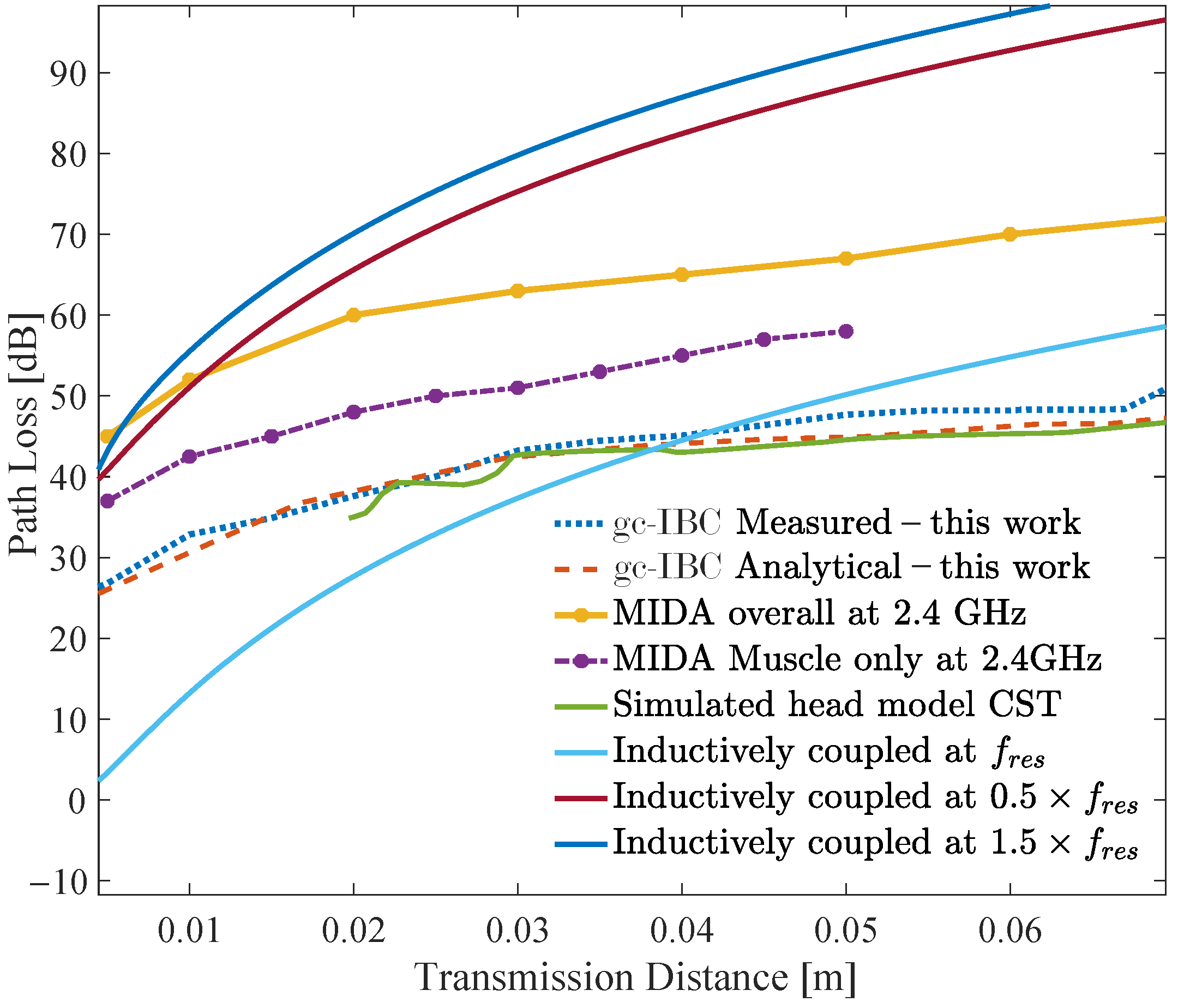A notable contrast emerges between the wireless RF and gc-IBC schemes. While both exhibit similar trends in path loss increase over distance—suggesting comparable fading characteristics under a log-normal shadowing model—the absolute values differ by as much as 20 dB. This substantial margin implies that, for the same transmitted power level, gc-IBC requires significantly less receiver-side gain—roughly two orders of magnitude lower—making it inherently more power-efficient. This characteristic enhances gc-IBC’s appeal for implantable applications, offering benefits such as simpler circuit design and better potential for miniaturisation. The elevated path loss associated with RF-based systems is largely attributable to tissue-specific electromagnetic properties: as operating frequency rises, tissue permittivity tends to decrease while conductivity increases. This leads to reduced penetration depth—commonly referred to as skin depth—at higher frequencies. Ironically, to minimise antenna dimensions for RF implants, much higher frequencies like those in the ISM and MedRadio bands must be used. However, this very approach exacerbates signal attenuation, creating a trade-off between antenna size and signal reachability.
