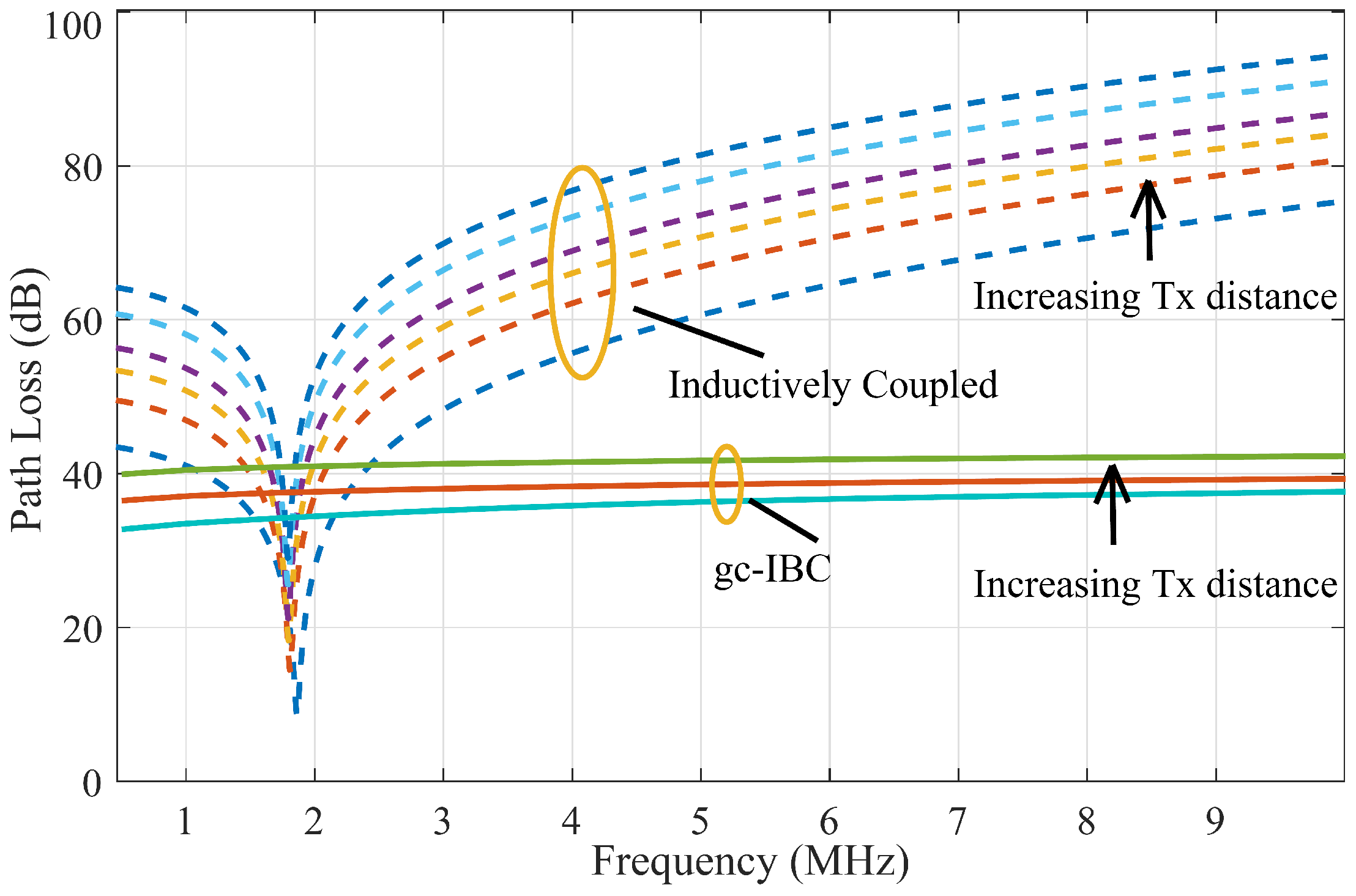 Figure 10 highlights that even modest deviations from the resonant frequency—by a few tens of kilohertz—can raise the inductive path loss by at least 10 dB compared to gc-IBC. At frequencies exceeding five times the resonance, the gap widens to as much as 50 dB, illustrating the narrowband constraint of inductive systems.