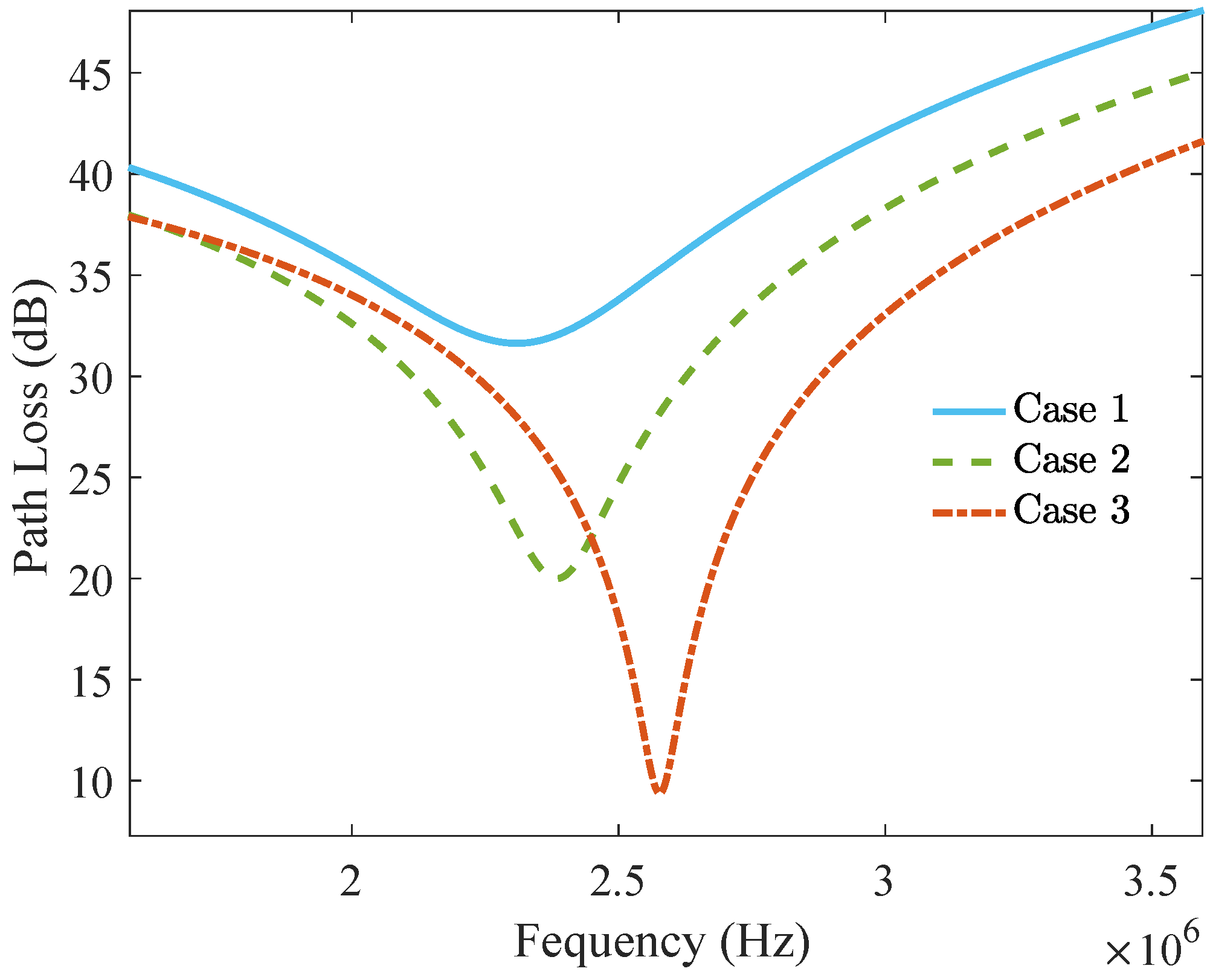 fres—the impedance mismatch becomes substantial, resulting in a path loss that exceeds those of both gc-IBC and antenna-based schemes. While the primary analysis assumes a resonance at 2 MHz,