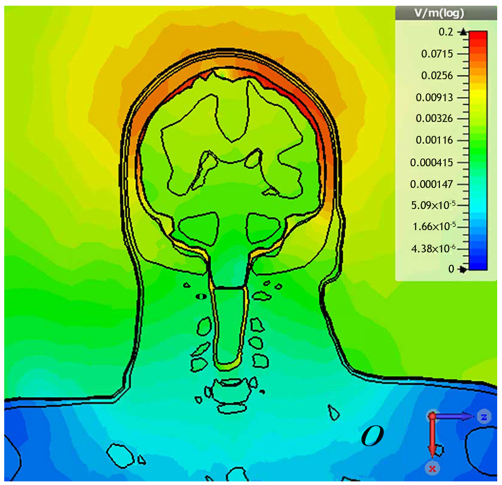 −2, remaining well within the ICNIRP’s permitted levels. Regarding the electric field, less conductive outer tissues permit deeper field penetration, whereas inner layers—being more conductive—attenuate it. As shown in