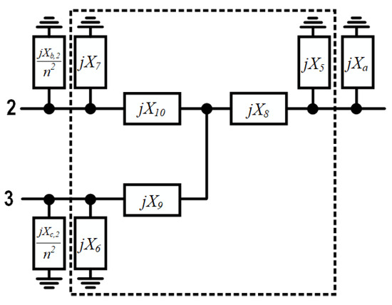 Assuming that a CTL is lossless, it can be equivalently represented by reactive elements [7]. By grounding one of the four ports of the CTL, the complex equivalent circuit can be effectively simplified while enabling the realization of non-Foster behavior [8]. Figure 2 illustrates the equivalent circuit of the CTL in Figure 1b with Port 4 shorted to ground. The reactance values shown in Figure 2 are derived as follows: