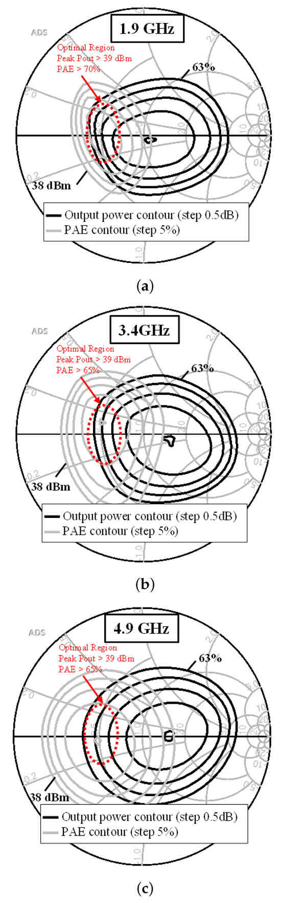 Simulated contours for output power and PAE: (a) 1.9 GHz, (b) 3.4 GHz, and (c) 4.9 GHz.