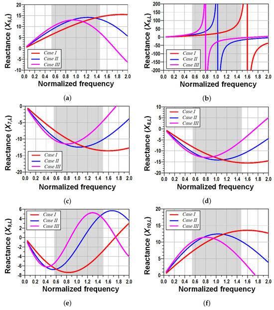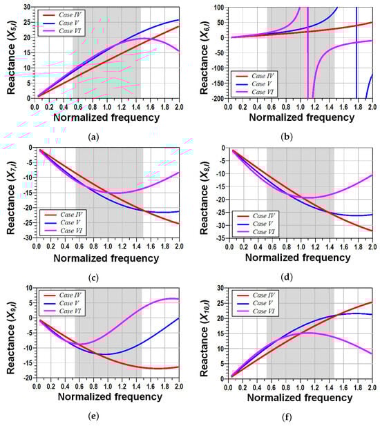 Calculated reactance values of the components in the equivalent circuit of the CTL for the load matching network according to the normalized frequency: (a) , (b) , (c) , (d) , (e) , (f) .