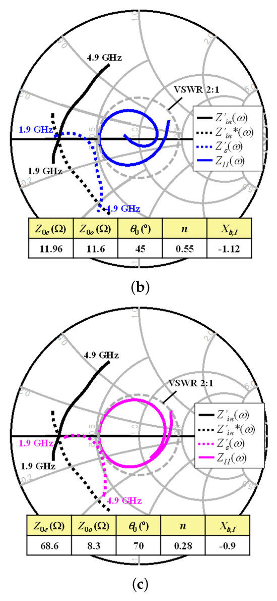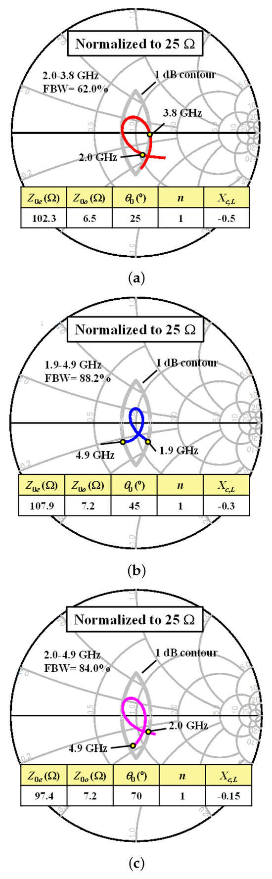 For the three selected cases, the simulated load impedances at the intrinsic planes of the transistors over the frequency range from 1.9 to 4.9 GHz are shown in Figure 6a–c, respectively. The parameters and n were determined such that the impedances at the intrinsic planes of the transistors satisfy the 1 dB output power contour over the widest possible frequency range. As observed in Figure 6b, when = , the designed network achieves the widest FBW of approximately 88.2%.