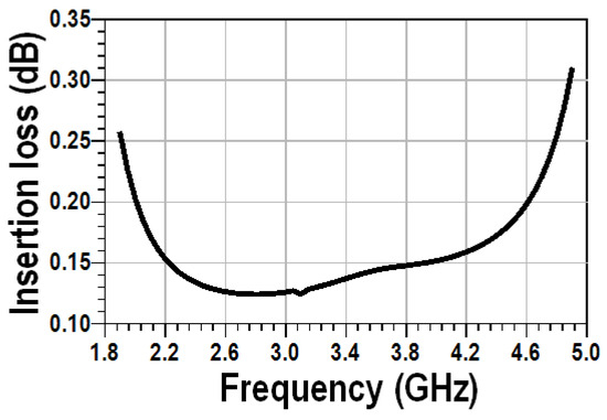 Figure 7 shows the simulated insertion loss of the CTL-based load network over the 1.9–4.9 GHz band. The loss remains below 0.3 dB across the entire operating frequency range, corresponding to a passive efficiency higher than 95%. This result confirms that the conductor, dielectric, and coupling losses of the CTL network are negligibly small and already included in the EM model used for the overall PA simulation.