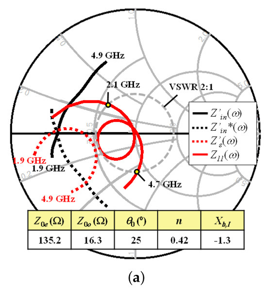 In Case 1, , , and exhibit non-Foster behavior, and as shown in Figure 8, their reactance values vary rapidly with frequency. As shown in Figure 9a, an input return loss better than 10 dB is achieved only within the 2.1–4.7 GHz range. In Case 2, the same elements also exhibit non-Foster behavior; however, most reactances vary more gradually with frequency. As shown in Figure 9b, remains closely distributed around the complex conjugate impedance () across the entire 1.9–4.9 GHz range, thereby achieving input return loss better than 10 dB throughout the band. In Case 3, all reactances show the smallest rate of change with frequency, as illustrated in Figure 9c. Nevertheless, as shown in Figure 9c, although the 10 dB input return loss condition is satisfied, is less aligned with compared with Case 2, resulting in a degraded broadband matching characteristic. Therefore, the non-Foster characteristics of the CTL must be carefully optimized to suit the impedance and frequency response requirements of the corresponding matching network.