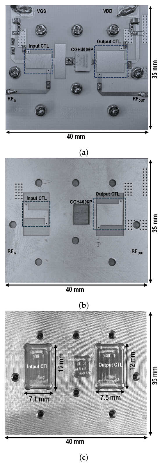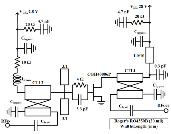 The broadband PA was designed using Cree’s CGH40006P GaN HEMT based on the proposed CTL-based impedance matching networks. Figure 10 presents the overall circuit schematic of the designed PA. The load matching network consists of a symmetric CTL with one port shorted to ground and a 0.3-pF shunt capacitor. The input matching network comprises an asymmetric CTL with one port shorted to ground, an open-circuited shunt stub, and a parallel RC network consisting of a 4- resistor and a 3.3-pF capacitor for stability enhancement.