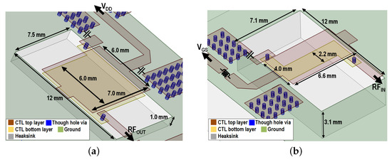 Three-dimensional view of the matching networks including CTLs on a two-layer PCB: (a) the load matching network (CTL1) and (b) the input matching network (CTL2).