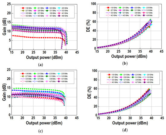 Simulated and measured power gain and DE using the CW signal for the frequency band of 1.9–4.9 GHz: (a) simulated gain, (b) simulated DE, (c) measured power gain, and (d) measured DE.