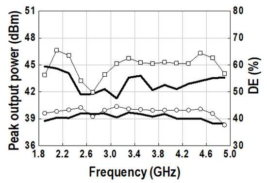 Simulated and measured peak output power and DE at peak power across the overall frequency band.