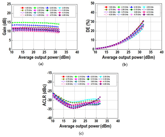 Measured performances using a 5G NR signal with a bandwidth of 100 MHz and a PAPR of 7.86 dB: (a) gain, (b) DE, and (c) ACLR.