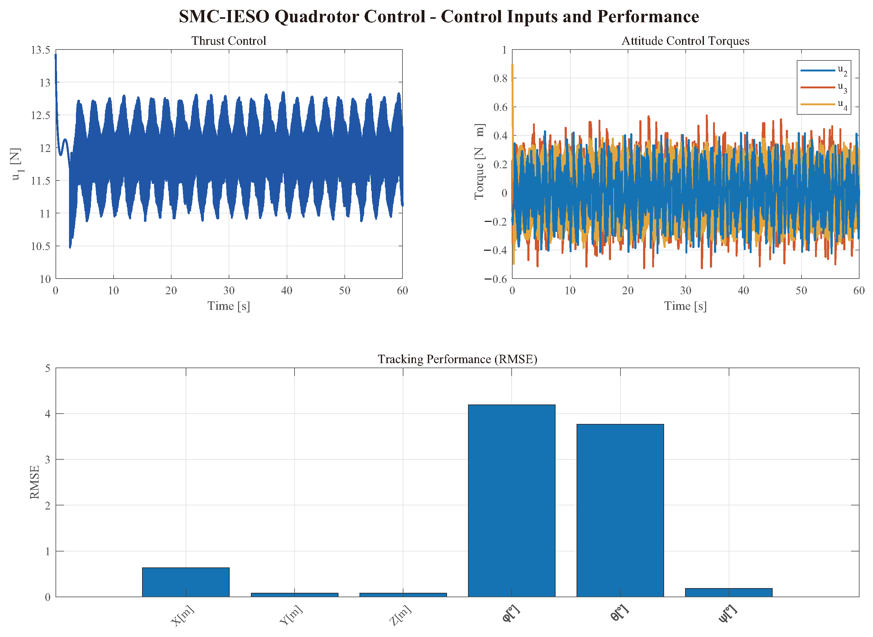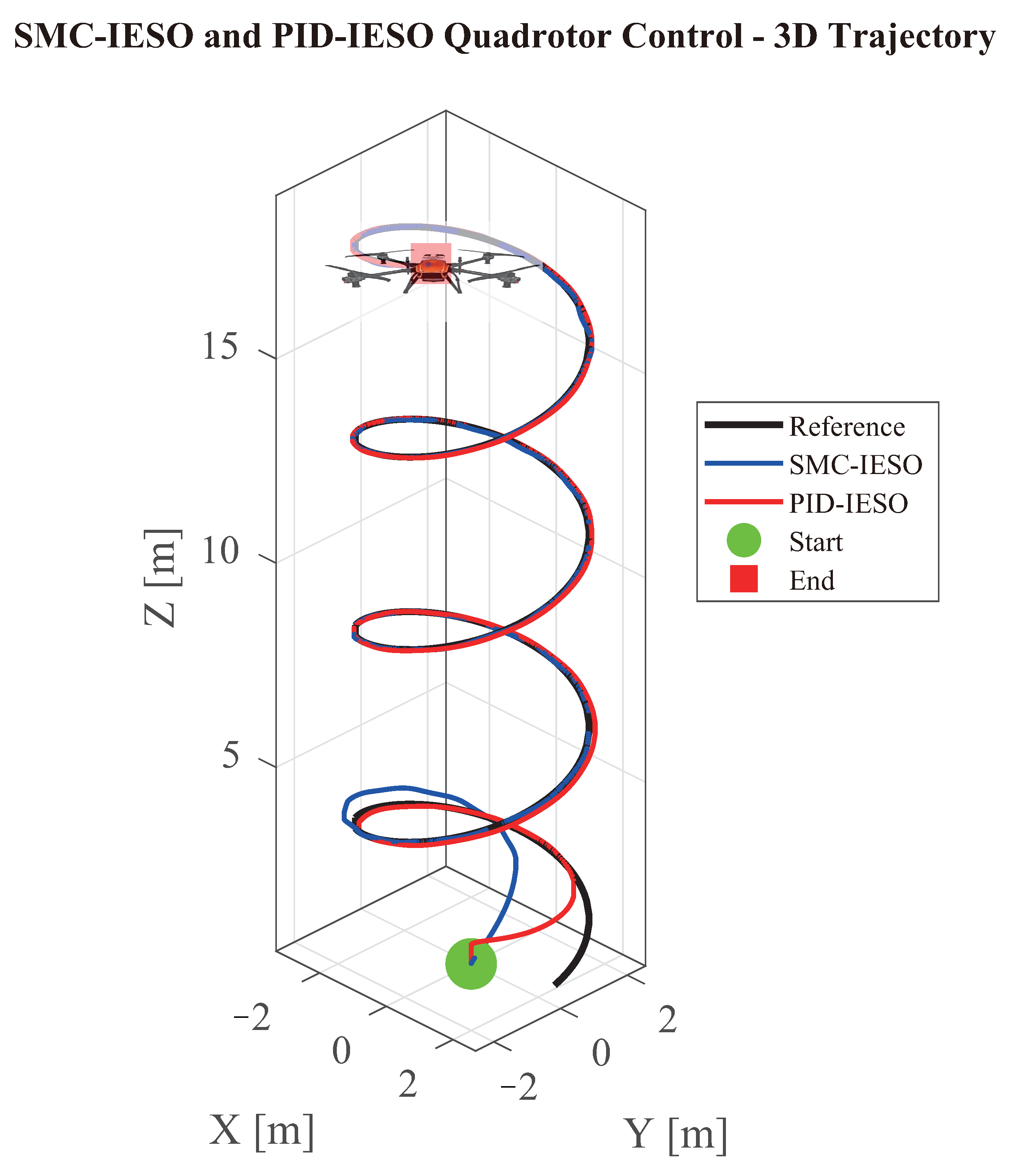 In summary, the hierarchical robust control architecture proposed in this section, through the SMC-IESO position control of the outer loop and the fast sliding mode attitude control of the inner loop, effectively solves the trajectory tracking problem of quadrotor UAVs. This control strategy not only handles the strong nonlinearity and coupling characteristics of the system but also effectively suppresses the influence of various external disturbances, providing theoretical support for high-precision control of quadrotor UAVs.