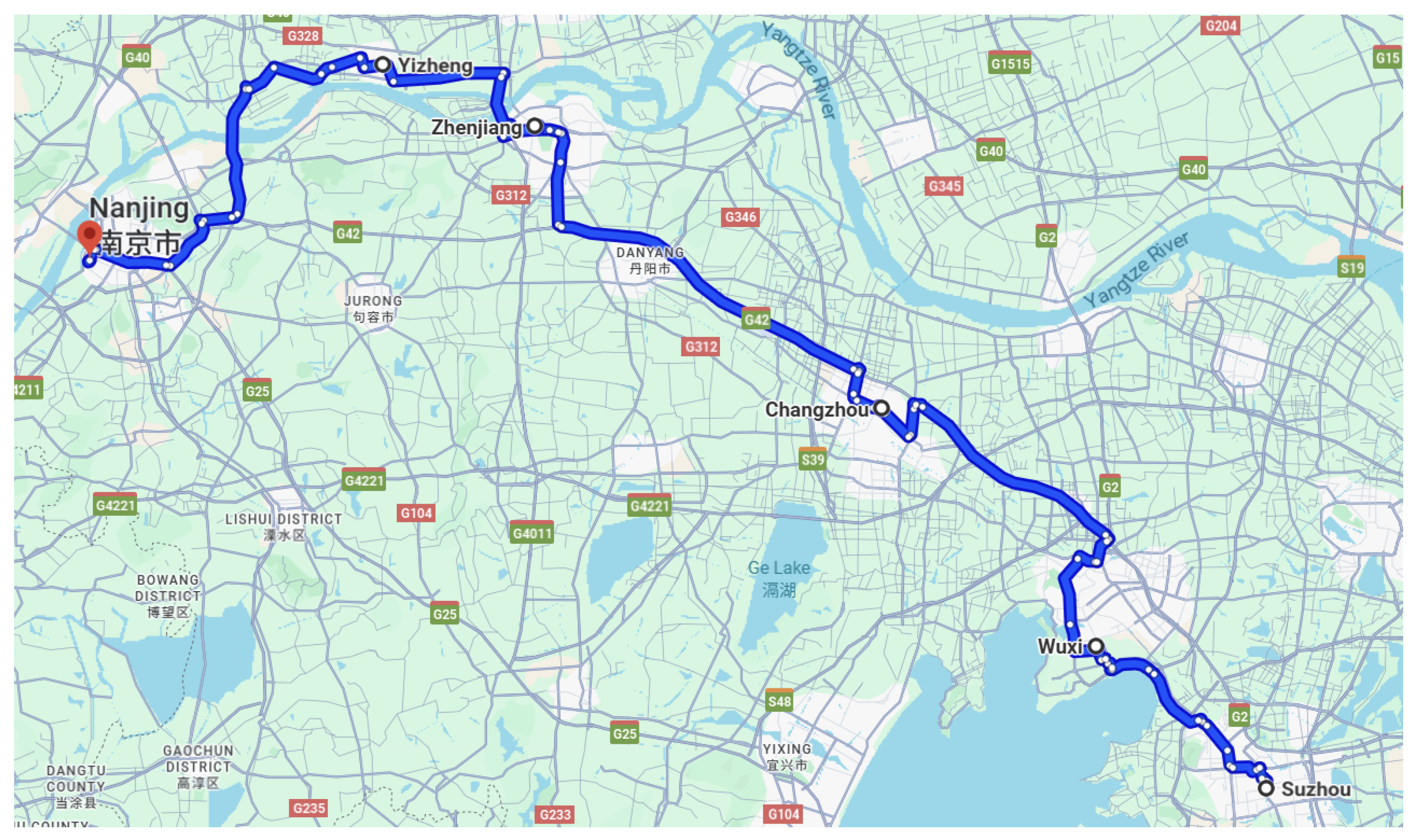 The platoon is allowed to reconfigure its formation at five designated re-sequencing stages between six checkpoints along the route: Suzhou (), Wuxi (), Changzhou (), Zhenjiang (), Yizheng (), and Nanjing (). The total route length is approximately 196.6 miles.