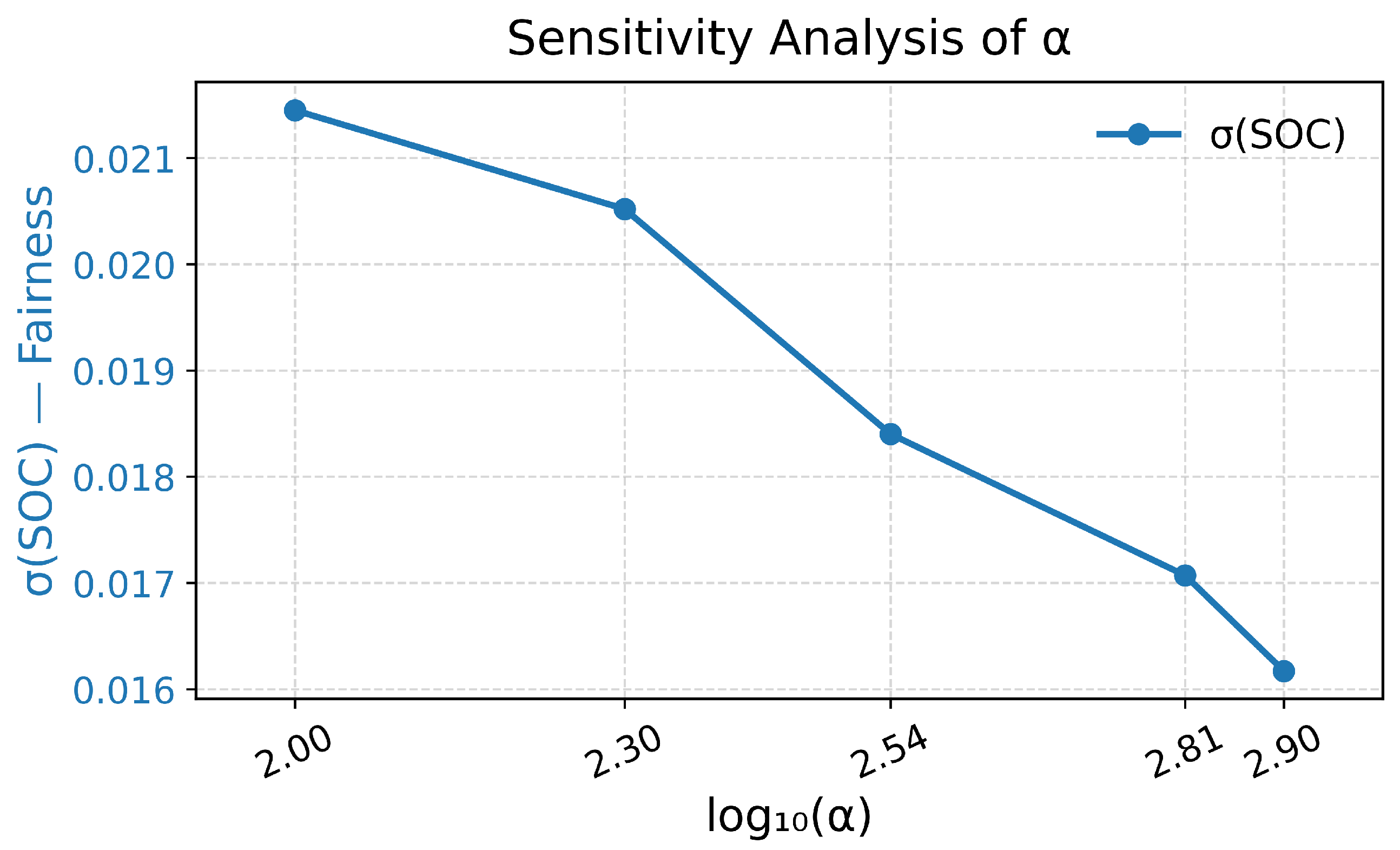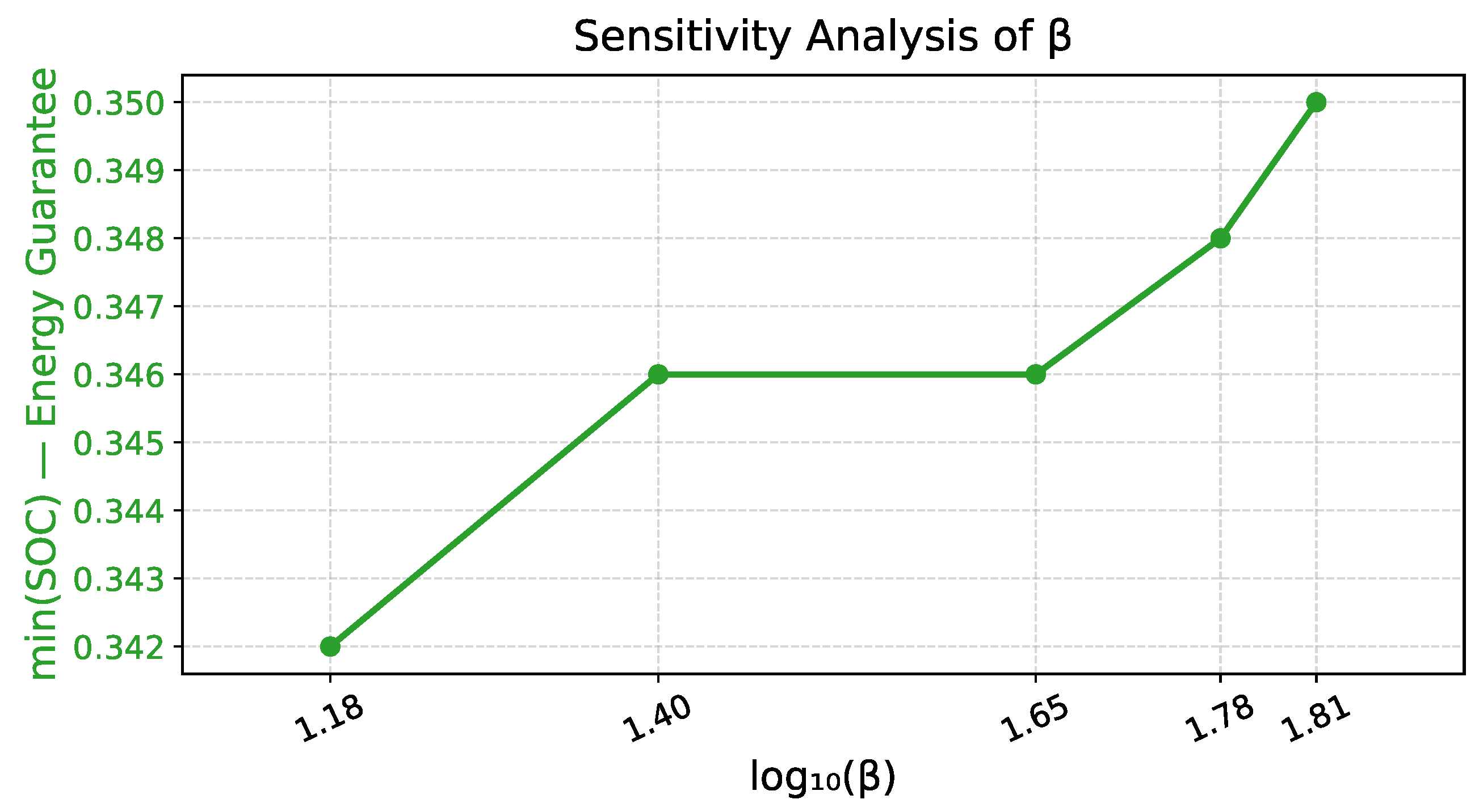 achieves balanced performance in terms of SOC deviation, minimum SOC, stability, and average reward. This value is therefore adopted in the main experiments.