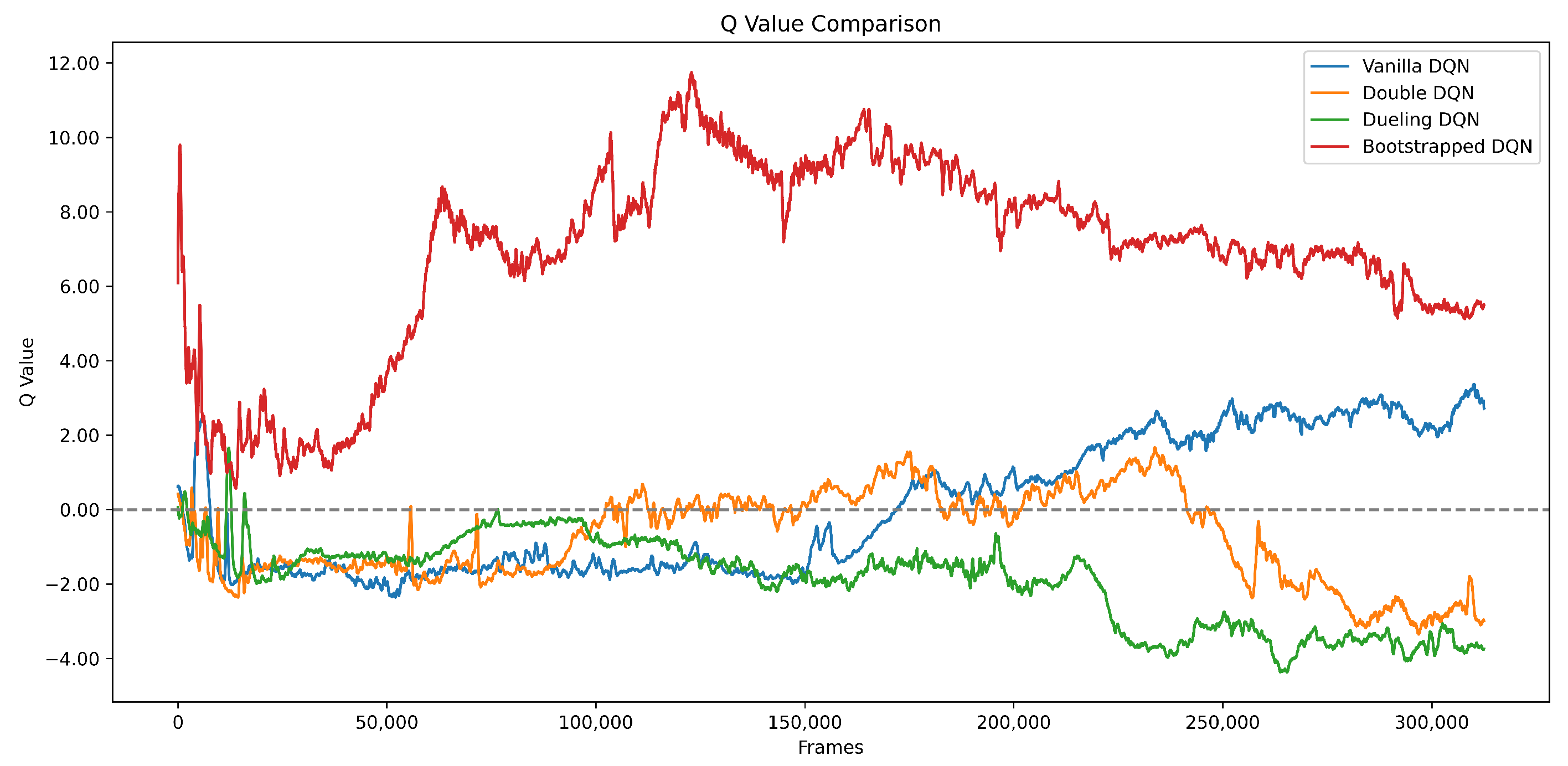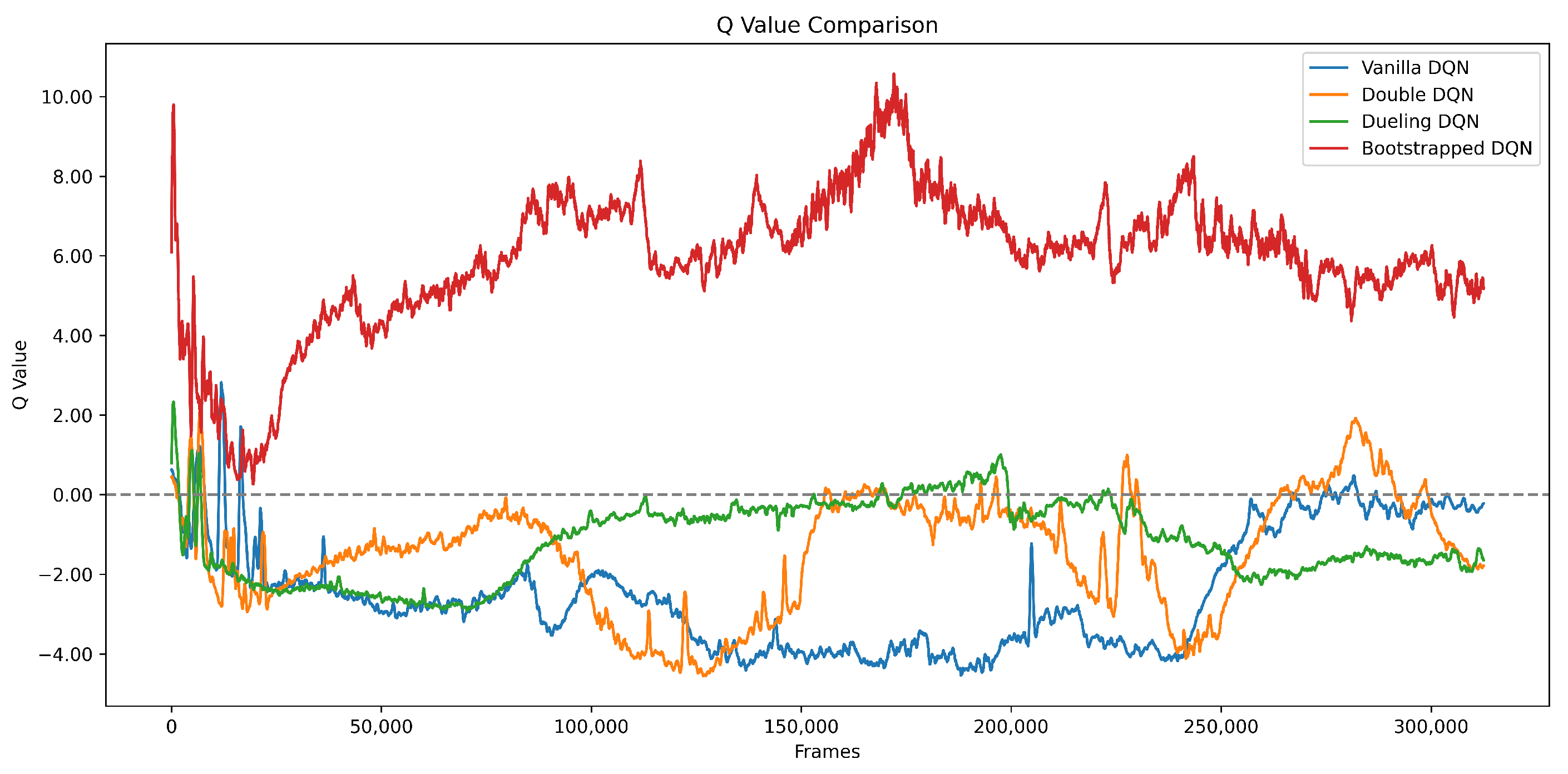 Figure 11 shows the Q-value trajectories during training without reward shaping. The Bootstrapped DQN increases rapidly between 20,000 and 60,000 frames and then stabilizes near 6, staying above the other algorithms throughout the process. Vanilla DQN remains mostly negative with only minor improvement toward the end. Double DQN fluctuates sharply around zero and does not reach convergence, whereas Dueling DQN achieves brief early gains followed by a gradual decline. Overall, Bootstrapped DQN preserves stable value estimation even in the absence of explicit reward guidance.