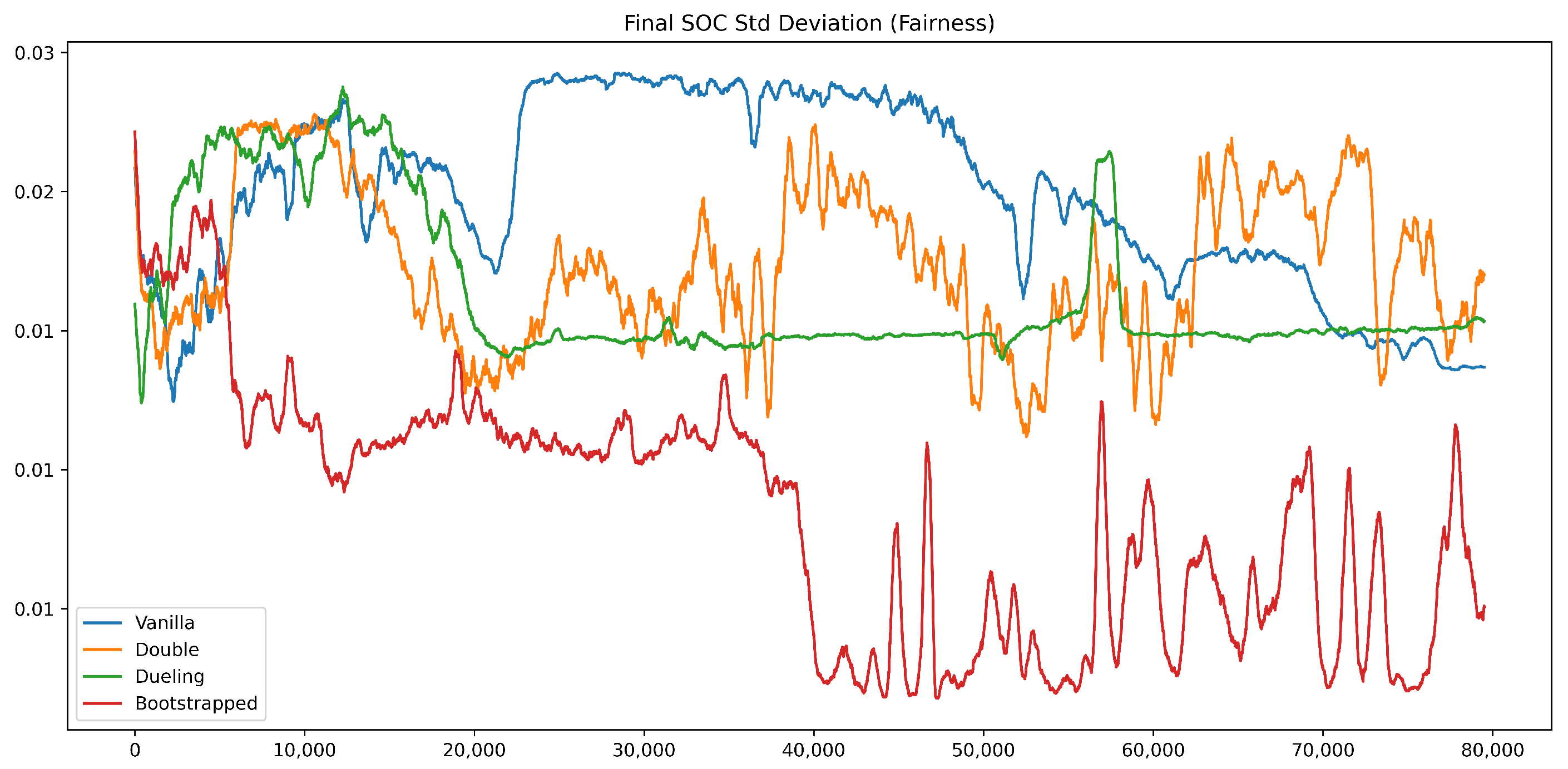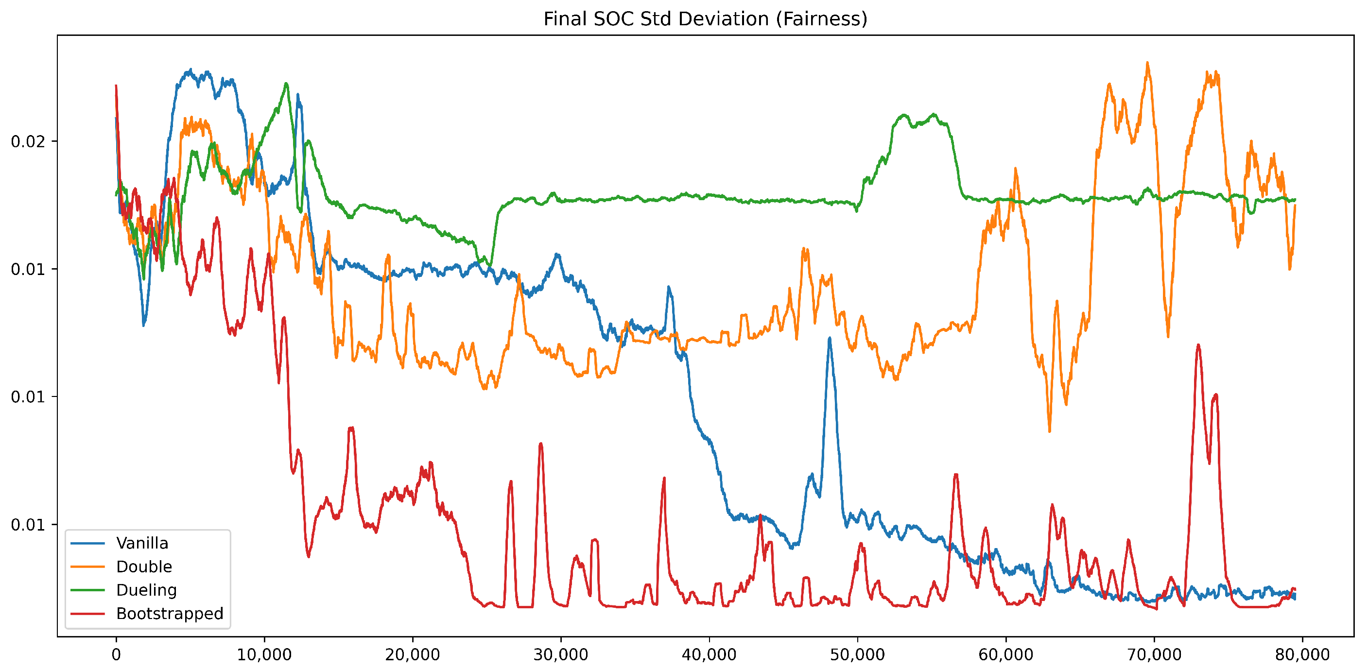 Figure 13 shows the convergence of the SOC standard deviation during training without reward shaping. The Bootstrapped DQN decreases rapidly and stabilizes around 0.008, reaching the lowest deviation among all algorithms. Vanilla DQN remains near 0.010 with mild fluctuations. Double DQN stays at the highest level between 0.021 and 0.025, showing strong volatility, whereas Dueling DQN stays relatively steady around 0.016 without further decline. Bootstrapped DQN still achieves the most balanced energy distribution among vehicles under this simplified training condition.