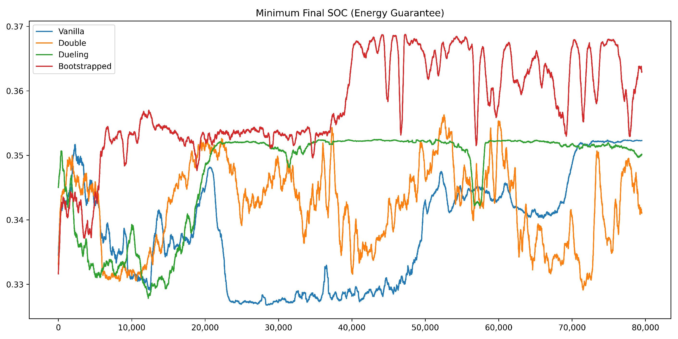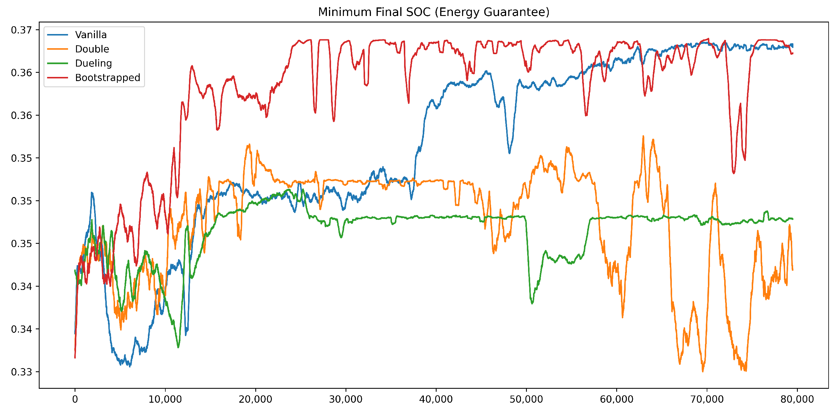 Figure 9 shows the evolution of the minimum remaining SOC during training. The Bootstrapped DQN rapidly raises the minimum SOC to about 0.36 within 20,000 episodes and keeps it at the highest level thereafter, reflecting a strong capability for maintaining energy reserves. Vanilla DQN improves more gradually and eventually reaches a similar level with mild fluctuations. Double DQN oscillates sharply and often drops below 0.345, whereas Dueling DQN stays nearly flat around 0.348. Taken together, these observations show that Bootstrapped DQN provides the most reliable energy assurance across the training process.