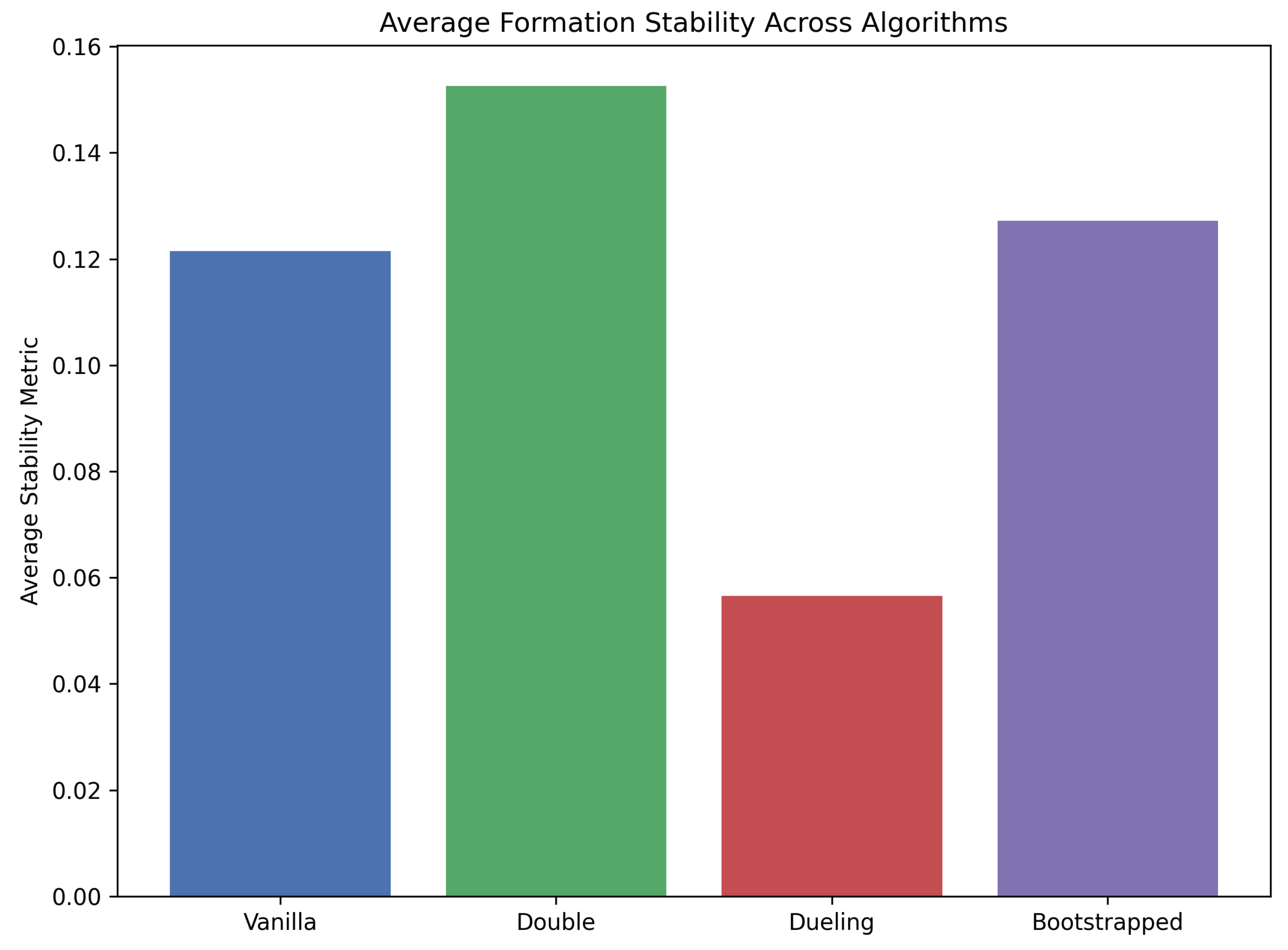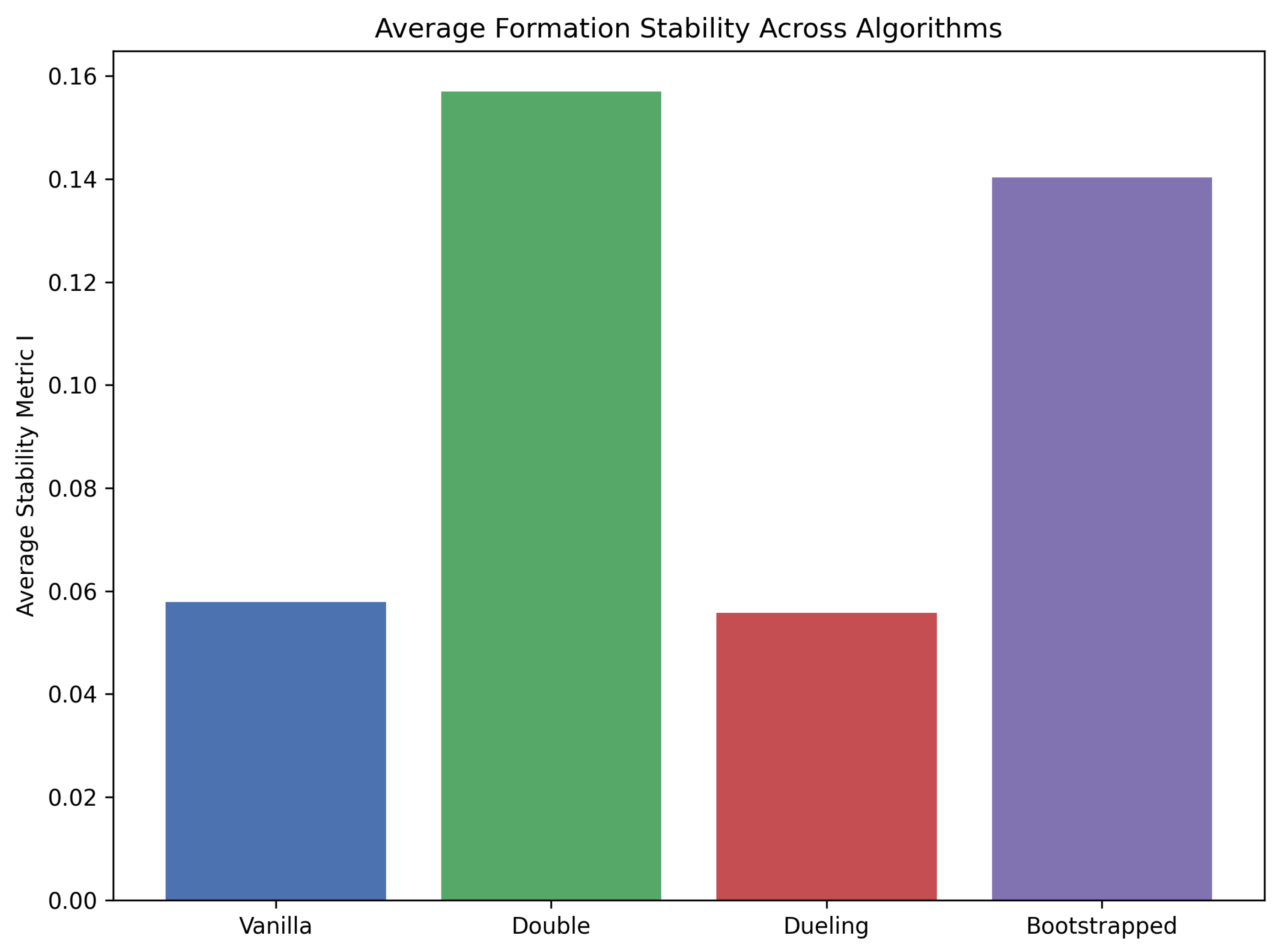 after convergence. Bootstrapped DQN and Vanilla DQN stay between the two extremes, keeping moderate stability levels. Among all methods, Bootstrapped DQN reaches a steady and balanced performance, indicating stable coordination without excessive formation changes.