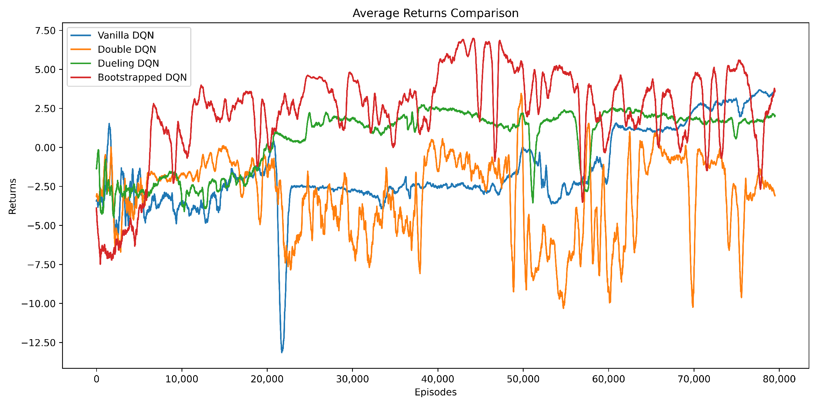 Figure 7 shows the evolution of the average return during training. The Bootstrapped DQN rises rapidly after about 10,000 episodes and maintains a high return thereafter, with minor oscillations that reflect active yet stable exploration. Vanilla DQN improves gradually and stabilizes at positive values in the later stage. Double DQN exhibits large fluctuations and frequently drops below zero, suggesting unstable policy learning. Dueling DQN remains close to zero throughout most of the training, showing limited progress. Compared with the other DQN variants, Bootstrapped DQN achieves both faster convergence and smoother learning dynamics.