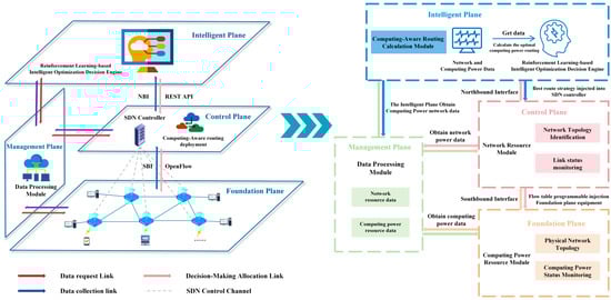 Management Plane—Computing and Networking Collaboration Layer. As a vertical interaction plane, the management plane aggregates, processes, and coordinates resource data. It obtains network data from the control plane and computing power data from the foundation plane, optimizes and integrates them, and sends them to the intelligent plane to provide quantitative support for subsequent dynamic routing decisions.