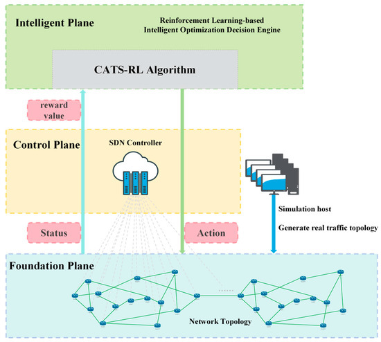 This section introduces the CAR-RL system architecture, as shown in Figure 1. The architecture consists of a foundation plane, a control plane, an intelligent plane, and a management plane: the foundation plane collects network status and computing power resource information, the control plane executes routing decisions, the intelligent plane dynamically optimizes the route through reinforcement learning algorithms, and the management plane interacts with other planes through top-down and bottom-up coordination. The system architecture is described in detail below.