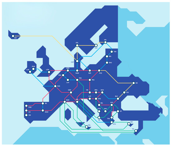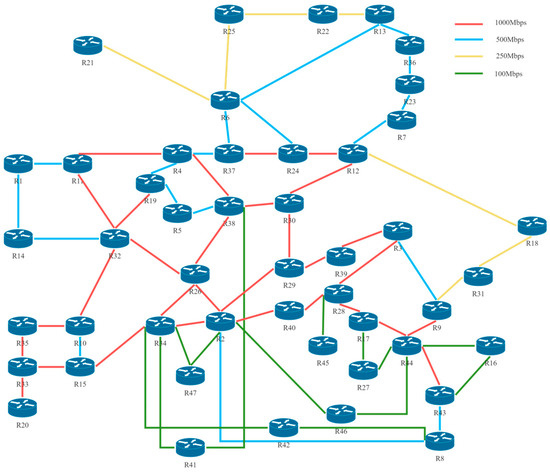 This experiment utilised the GN4–3N (GEANT Network 4–Phase 3 Network) [36] logical topology, as shown in Figure 3. This topology represents a typical architecture of European high-performance education networks, comprising 47 nodes and 68 bidirectional links. GN4–3N integrates three representative sub-structures: fat tree, ring-mesh, and hierarchical tree. This enables simulation of real high-performance networks with diverse latency and bandwidth characteristics, while exhibiting wide-area network traits such as long-distance links and variable traffic patterns. This fully demonstrates the algorithm’s effectiveness within typical distributed systems. The experiment utilises a K8S cluster to simulate computing power resources, validating the performance of the CAR-RL algorithm.