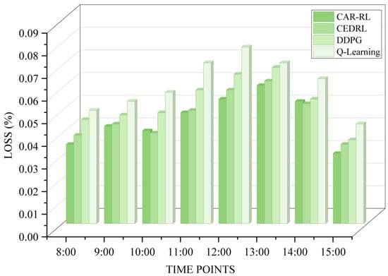 To comprehensively evaluate the performance of the CAR-RL algorithm, this experiment simulated uniform and high-load scenarios under a unified testing environment and standardized parameters. Data from eight hourly intervals between 8:00 and 15:00 were selected to compare key performance metrics of the CAR-RL algorithm against Q-Learning [32], CEDRL [33], and DDPG [26]. Specifically, the average packet loss rate, average latency, and average throughput of the optimal computing power path generated by the CAR-RL algorithm after identifying the optimal computing power node were compared with the results from the reinforcement learning-based routing algorithm Q-Learning, the deep reinforcement learning-based deterministic policy gradient DDPG algorithm, and the deep reinforcement learning-based computationally aware CEDRL algorithm. Through these comparisons, this paper verifies the superiority of CAR-RL over traditional and some improved algorithms. The experimental results are shown below.