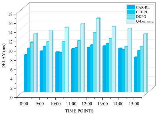 Figure 6 compares the average latency of CAR-RL and the other three algorithms across eight time periods. Data indicates CAR-RL’s latency ranged from 7.5 ms to 9.9 ms, with a mean of 8.89 ms and a standard deviation of 0.77 ms. Q-Learning’s latency ranged from 12.5 ms to 15.9 ms, with a mean of 13.8 ms and standard deviation of 1.07 ms; DDPG’s latency ranged from 9.8 ms to 12.8 ms, with a mean of 10.91 ms and standard deviation of 0.90 ms; The CEDRL algorithm’s latency ranged from 8.5 ms to 10.4 ms, with a mean of 9.46 ms and a standard deviation of 0.59 ms. CAR-RL’s average latency was approximately 35.6% lower than Q-Learning’s, about 18.6% lower than DDPG’s, and roughly 6.1% lower than CEDRL’s.