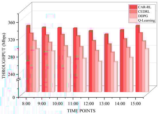 Figure 7 compares the average throughput of the CAR-RL algorithm and the other three algorithms across eight time periods. Between 8:00 and 15:00, CAR-RL’s throughput ranged from 320 Mbps to 340 Mbps, with a mean of 333 Mbps and a standard deviation of 6.3 Mbps. The Q-Learning algorithm’s throughput ranged from 256 Mbps to 286 Mbps, with a mean of 270 Mbps and a standard deviation of 11.5 Mbps. The DDPG algorithm’s range was 278 Mbps to 305 Mbps, averaging 293 Mbps with a standard deviation of 9.3 Mbps. The CEDRL algorithm’s range was 297 Mbps to 323 Mbps, with a mean of 314 Mbps and a standard deviation of 8.5 Mbps. CAR-RL’s average throughput exceeded Q-Learning’s by approximately 23.1%, surpassed DDPG’s by about 13.7%, and outperformed CEDRL’s by roughly 6.2%.
