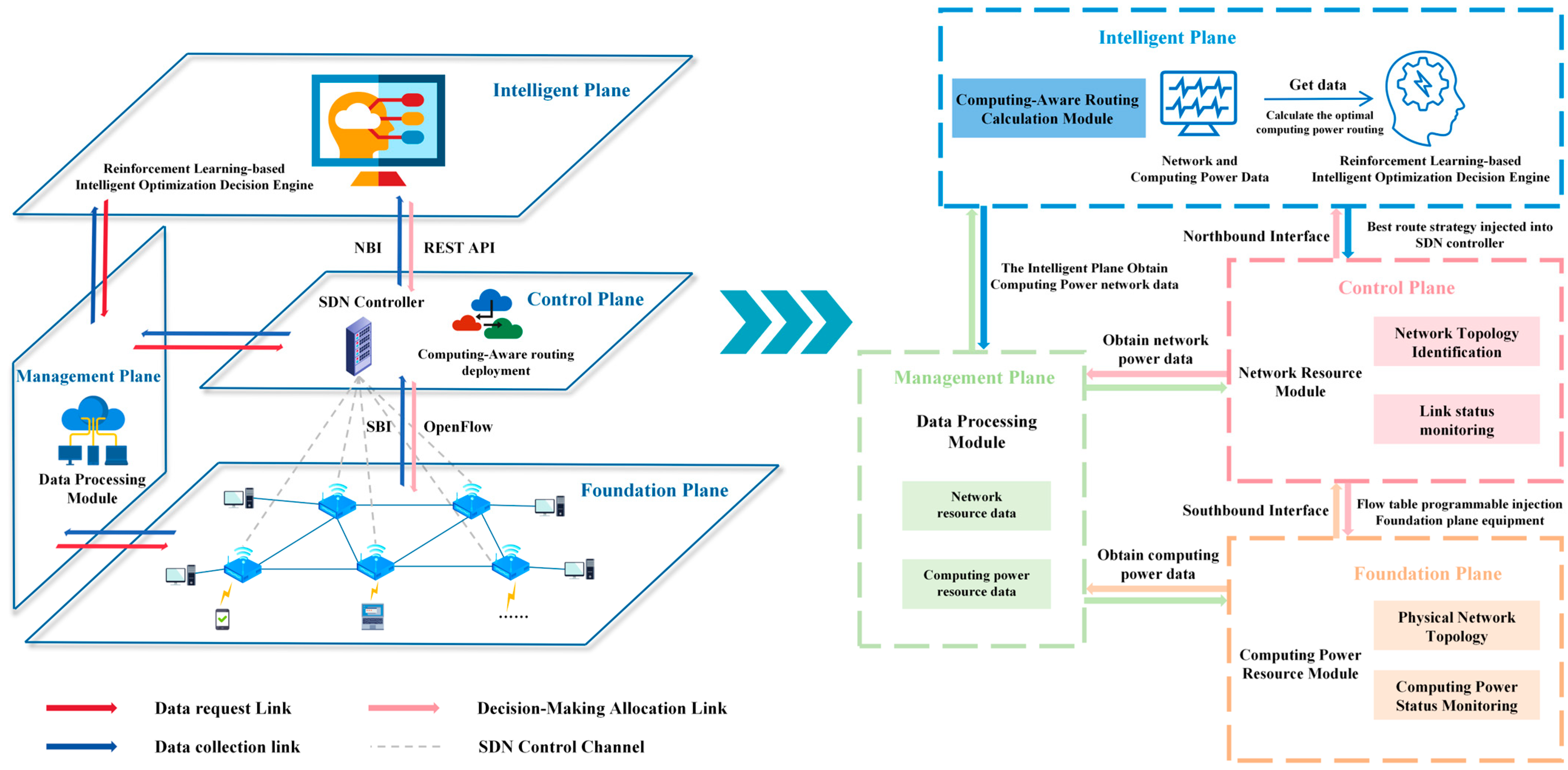 | Our research | 2025 | CAR-RL | Selects optimal computing-aware routing paths by real-time perception of network traffic and computing power status | - |