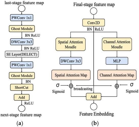 The architecture of the two core innovative components in FV-LiteNet, they should be listed as: (a) Ghost bottleneck used in FV-LiteNet; in the last two stride-2 the SE (squeeze–excitation) is removed to reduce parameters and latency; (b) The proposed spatial-channel attention head, which replaces the original classification layer. Abbreviations: Conv2D (standard convolution), DWConv (Depthwise Convolution), PWConv (Pointwise Convolution).